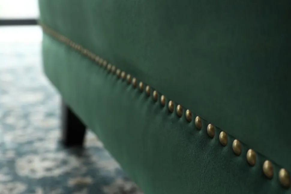 Soffa klädd i grönt tyg med nitar som en snygg detalj. Soffan är klädd i grönt mjukt sammetstyg. Ballas är en stilren med mycket karaktör. Bruna massiva träben.