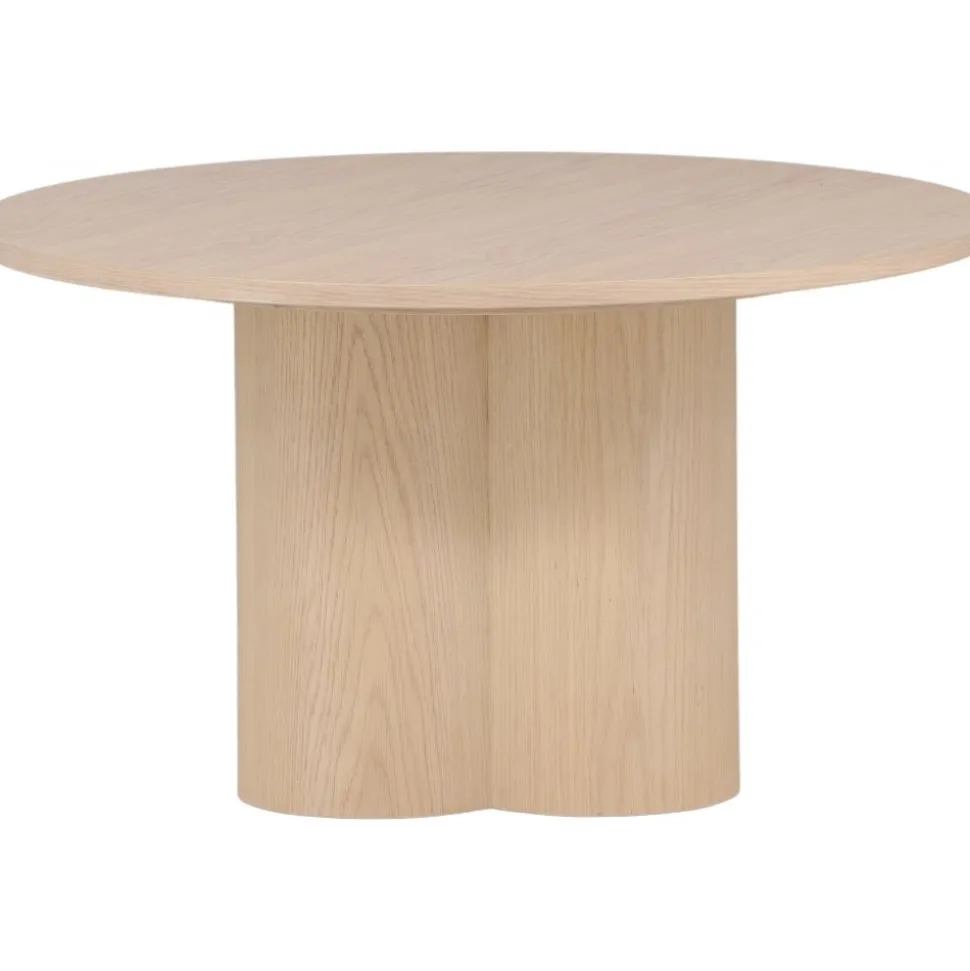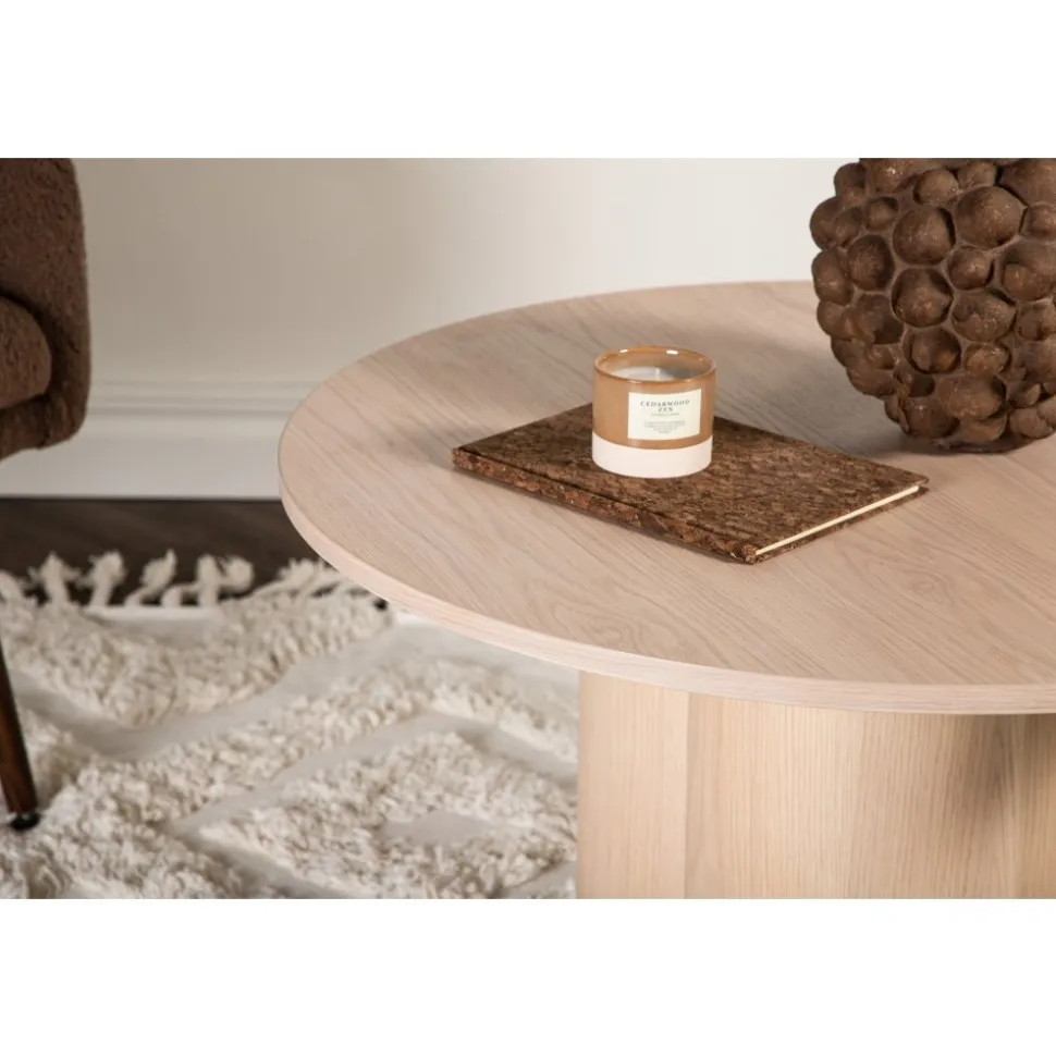 Modernt som imponerar med sina mjuka former, stilrena design och trendsäkra kulör. Soffbordet är tillverkat i vitputsad MDF och har en cylinderformad uppbyggnad vilket skapar en läcker dimension till bordet. Den runda toppskivan är fanerad och stommen utgörs av tre cylinderformade ben, samlade under bordets mitt. Bordet är otroligt användbart både som soffbord eller sidobord och den nätta storleken gör bordet enkelt att placera och flytta runt i hemmet.