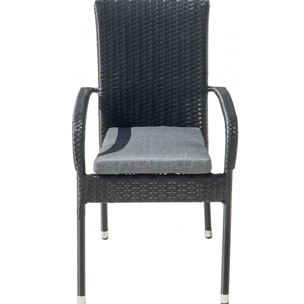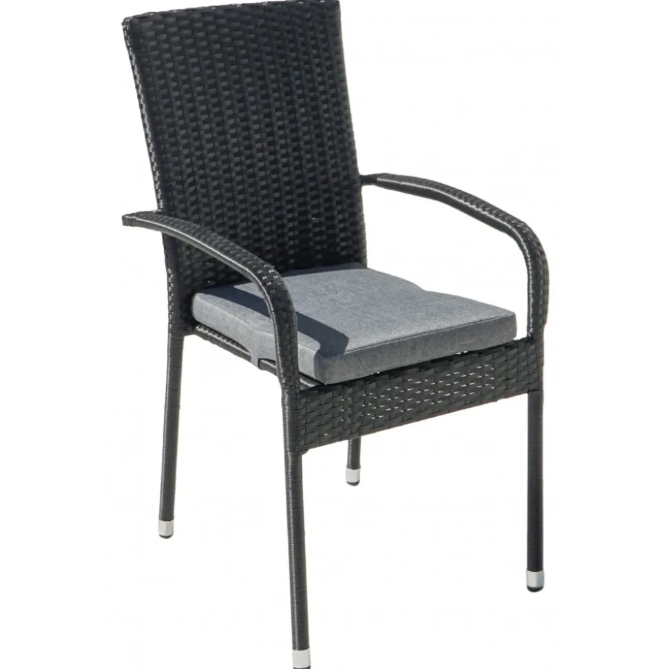 Klassisk i svart konstrotting inklusive sittdyna i grått 230grams tyg. Stolen är stapelbar för att kunna förvaras lätt och praktiskt. Perfekt till matbordet och uteplatsen.