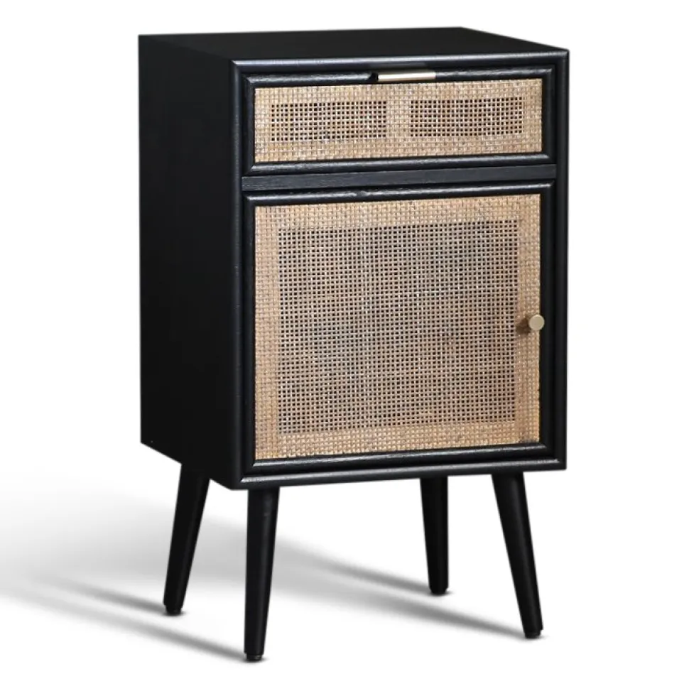 - Material: Sängbordet är tillverkat av svart trä med fronter i ljus rotting, vilket ger en stilren och elegant look.