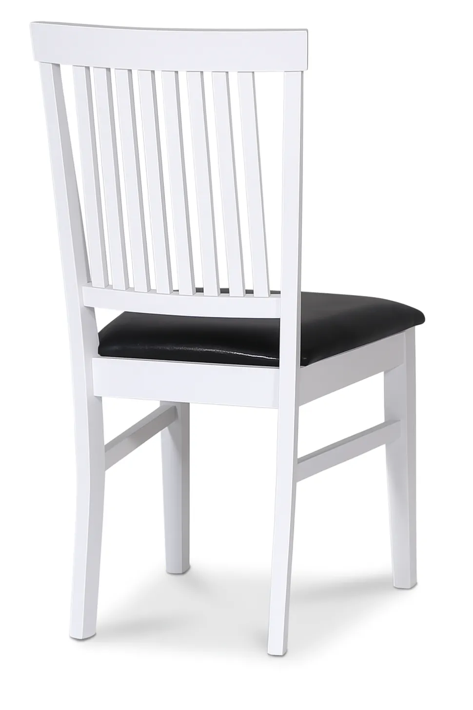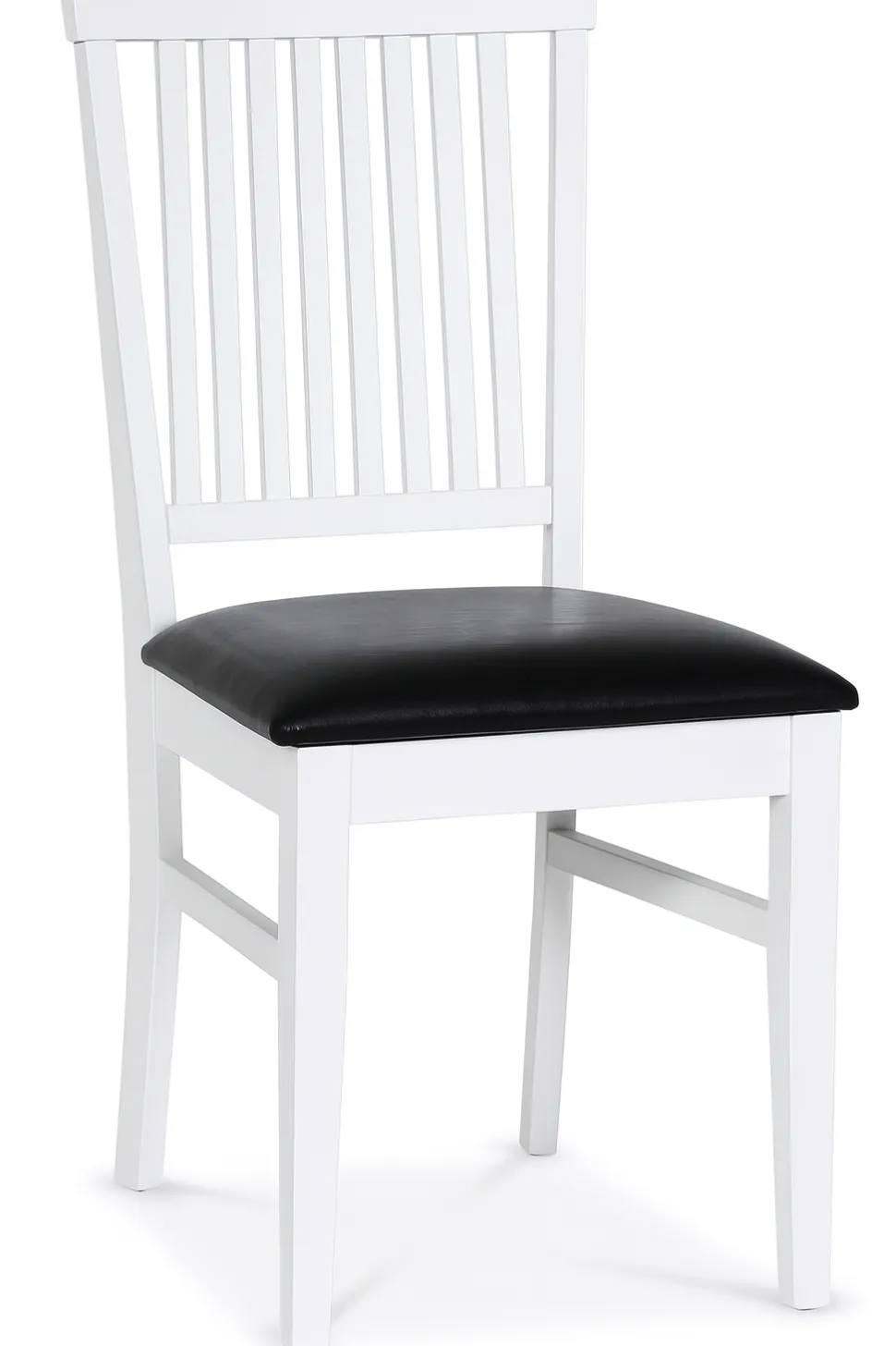 Våra matrums serier Fårö, Skagen och Dalarö är utformade i klassisk design där stilren design möter kvalitet. Denna med stomme i vitlackat massivt trä med sits i svart tålig PU. Matstol med raka ribbor i ryggen som en klassisk detalj.