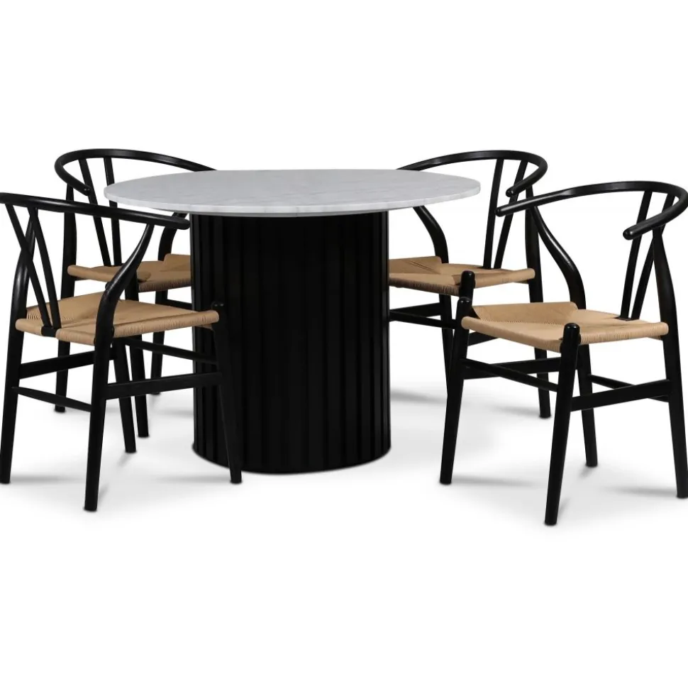 Klassiska matstolar i karm-modell med svartlackad stomme i almträ och flätad repsits. Levereras monterad. Design som varar i framtiden.