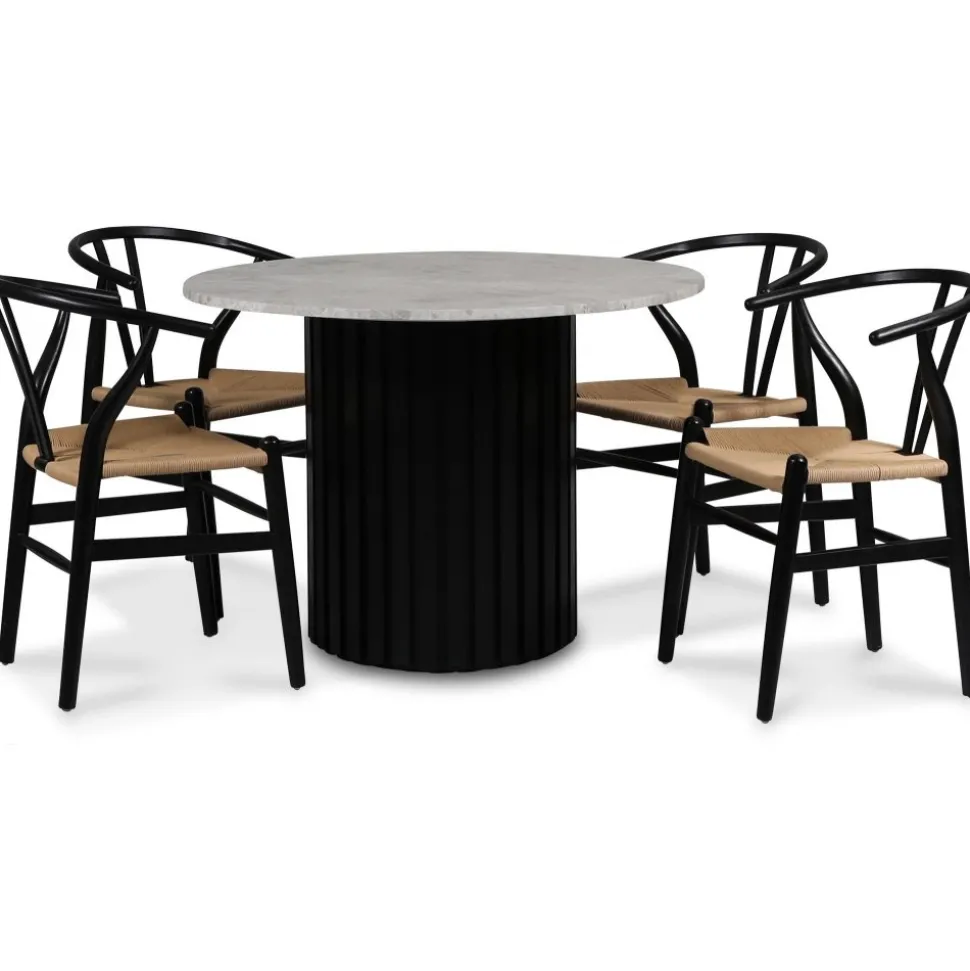 - Sumo matgrupp Ø105 cm inkl. 4 st Brandon svarta matstolar – Svartbets / Silver marmor