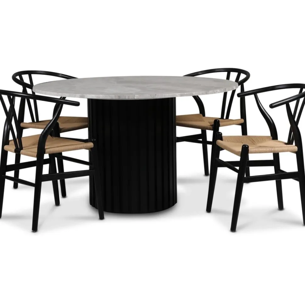 - Sumo matgrupp Ø130cm inkl. 4 st Brandon svarta matstolar – Svartbets / Silver marmor