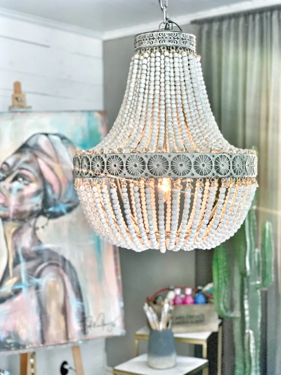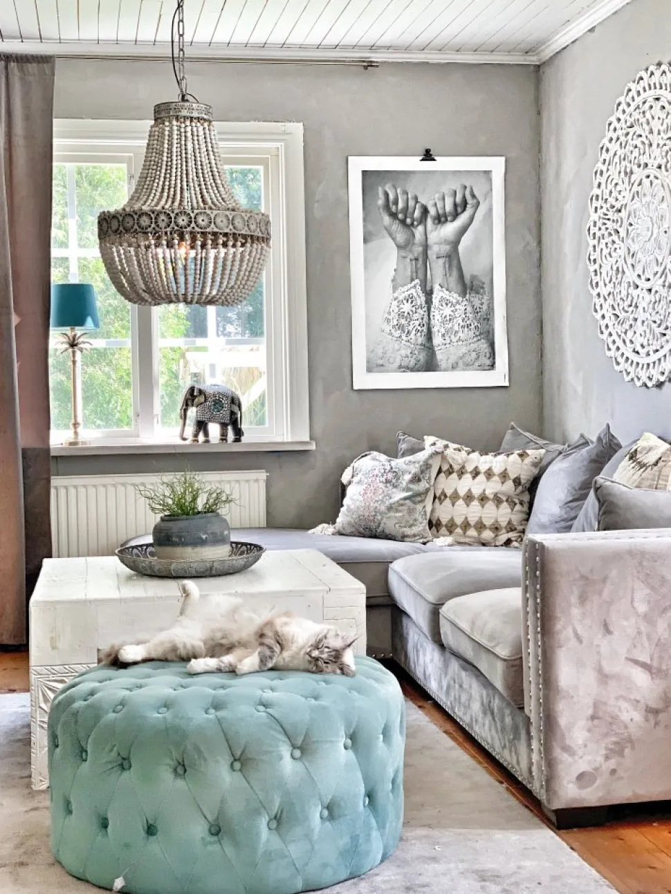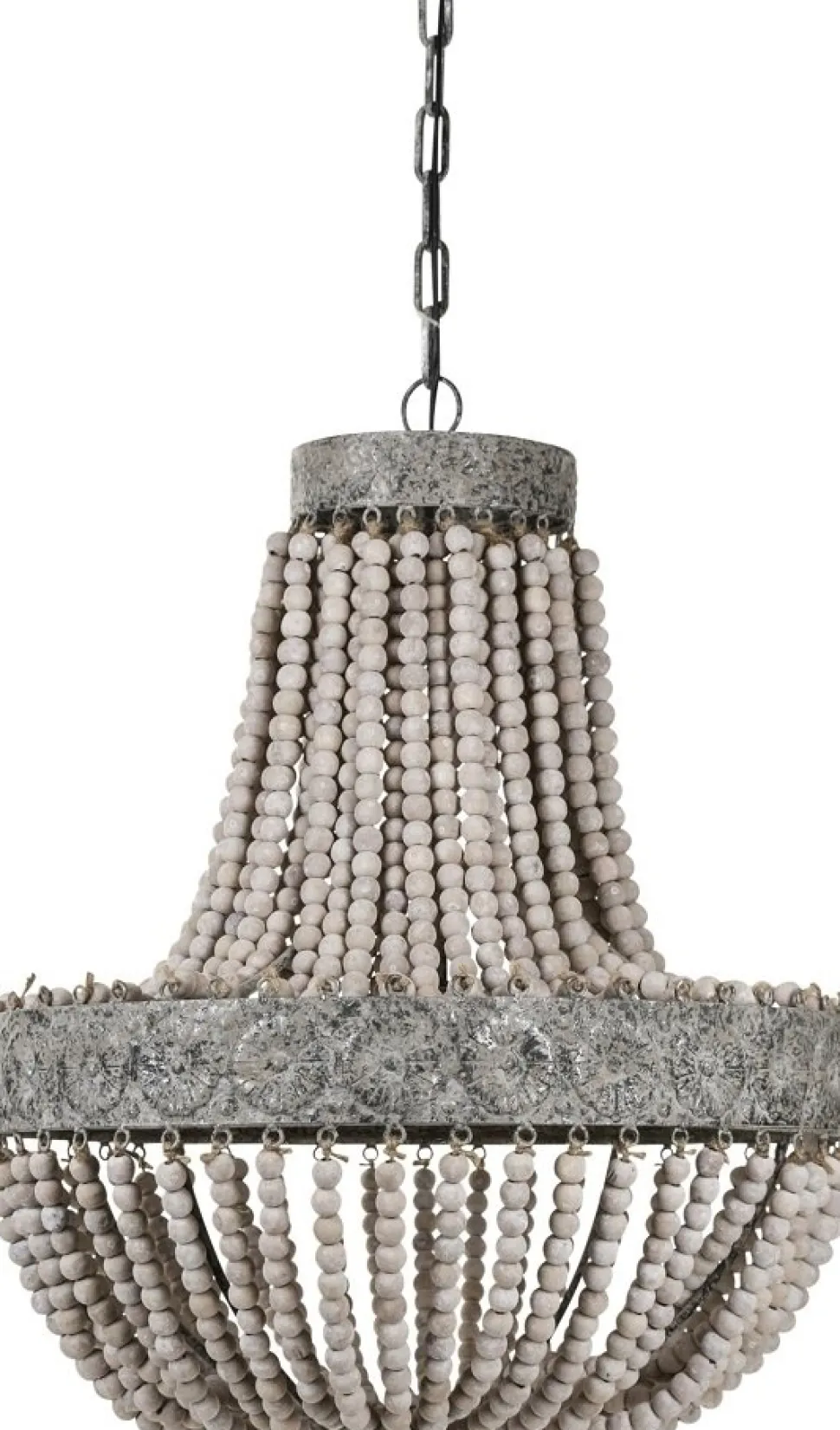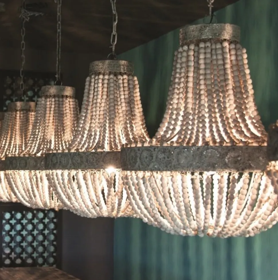 O&J är en elegant och pampig takkrona med handträdda träkulor på rep som ger en härlig vintagekänsla. Lampan ger en härlig belysning.