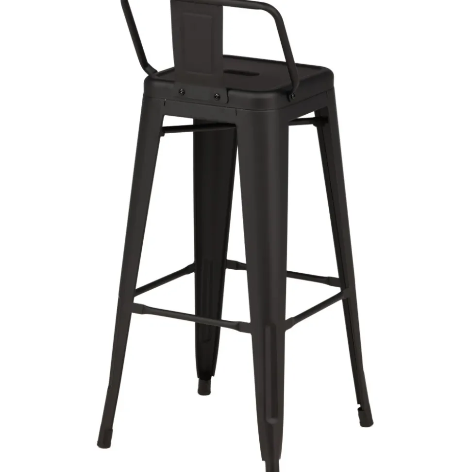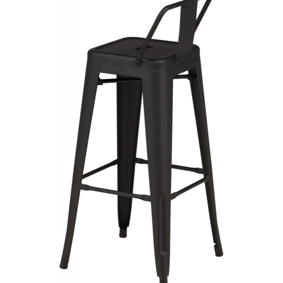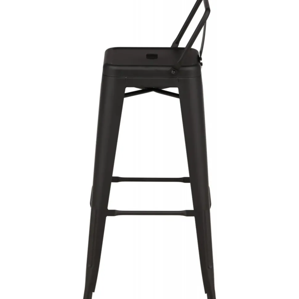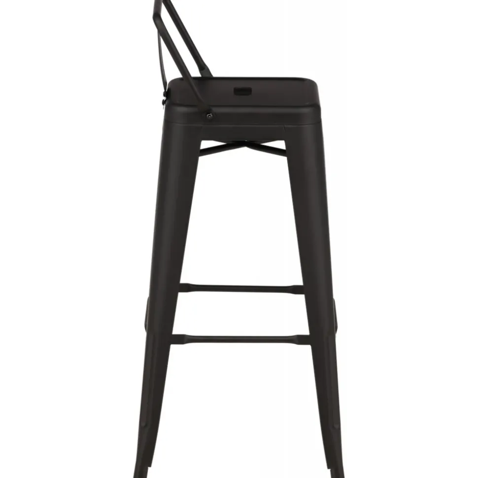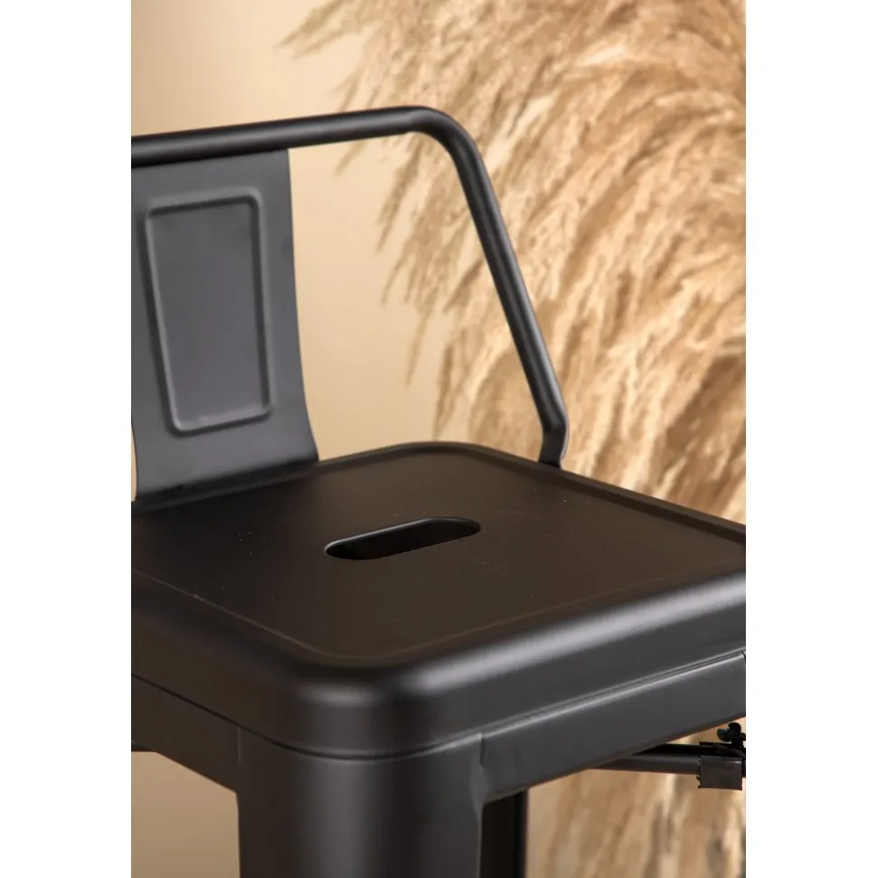 Barstol med en klassisk design av en högre pall med lätt utsvängda ben och sits med ett lägre ryggstöd i svart stål och en ram för fotstöd. Perfekt för dig med öppen planlösning i köket som önskar skapa plats för sittande sällskap när du lagar mat – eller varför inte kring ett högre matbord.