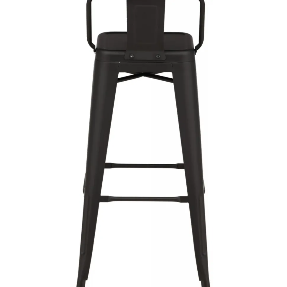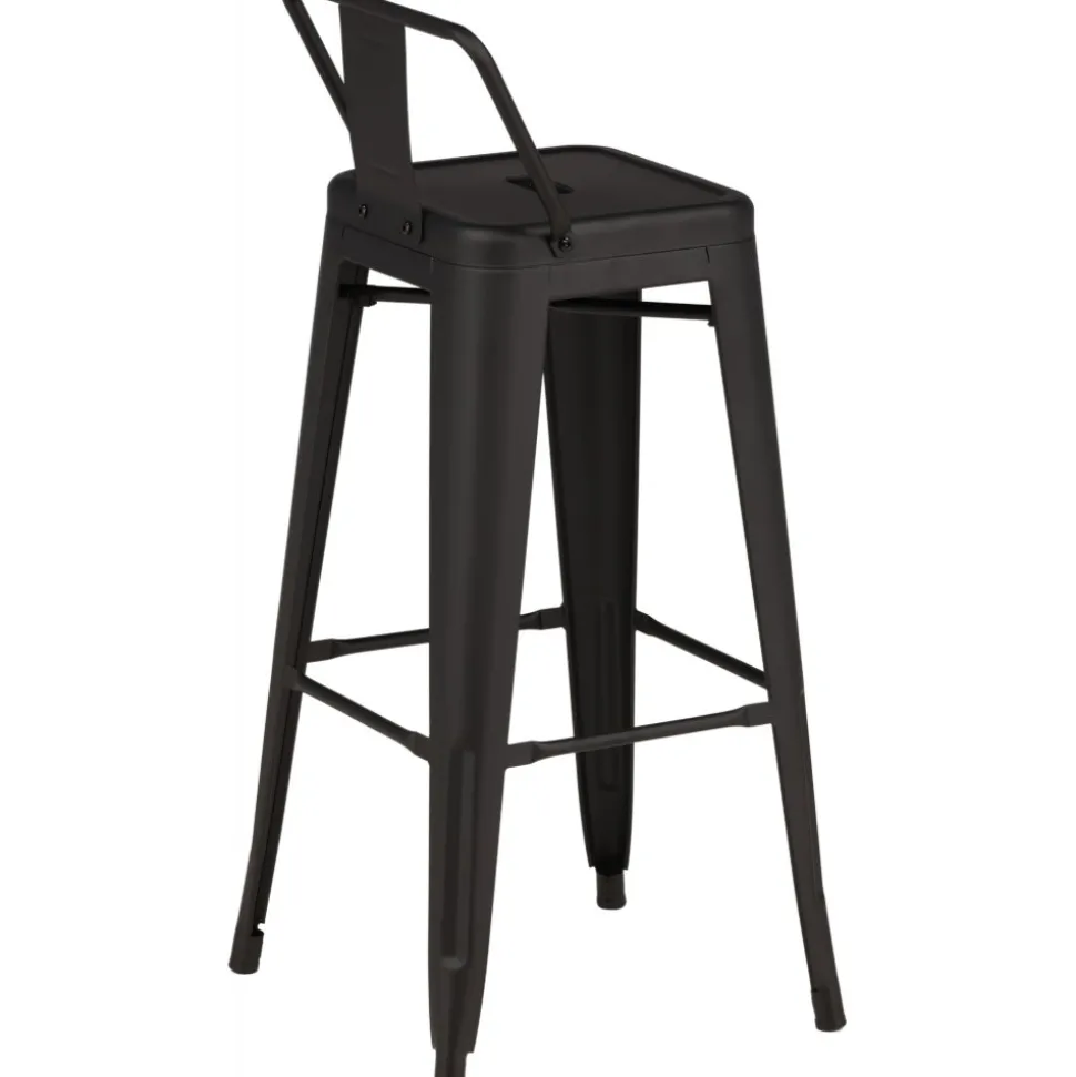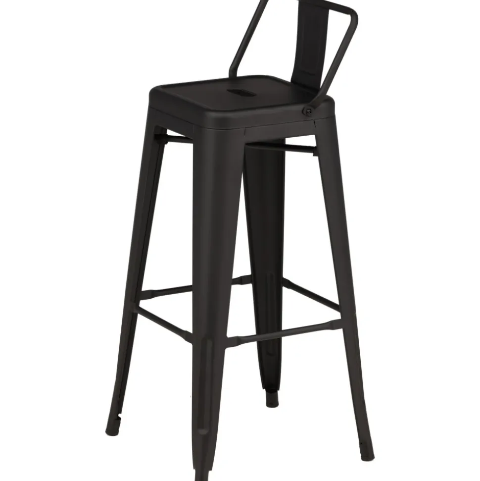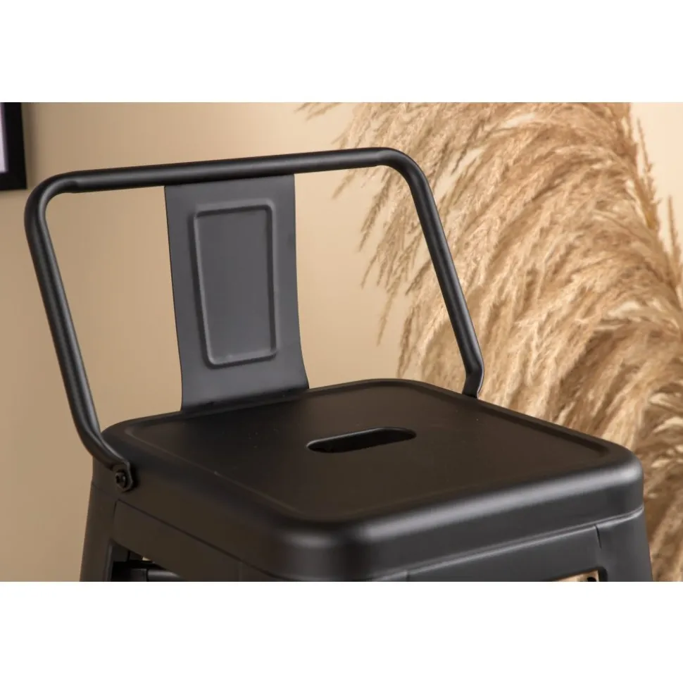 Barstol med en klassisk design av en högre pall med lätt utsvängda ben och sits med ett lägre ryggstöd i svart stål och en ram för fotstöd. Perfekt för dig med öppen planlösning i köket som önskar skapa plats för sittande sällskap när du lagar mat – eller varför inte kring ett högre matbord.
