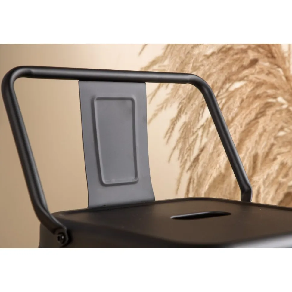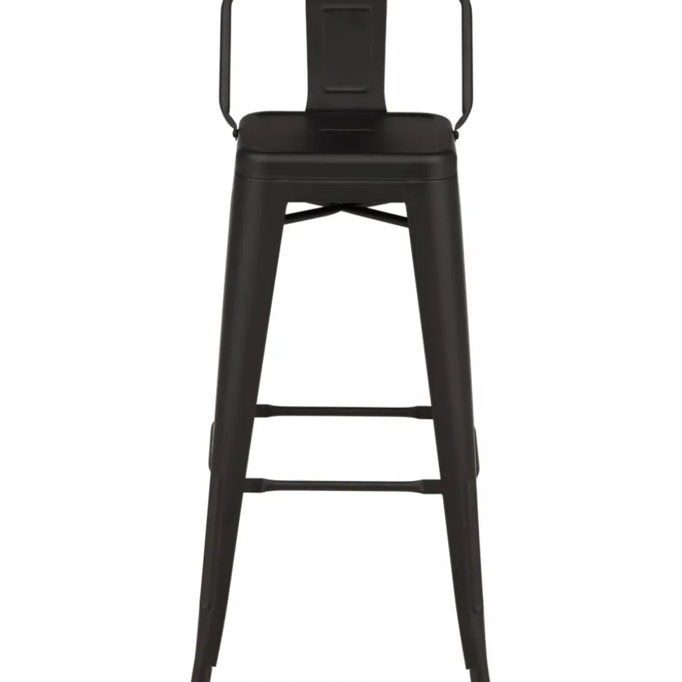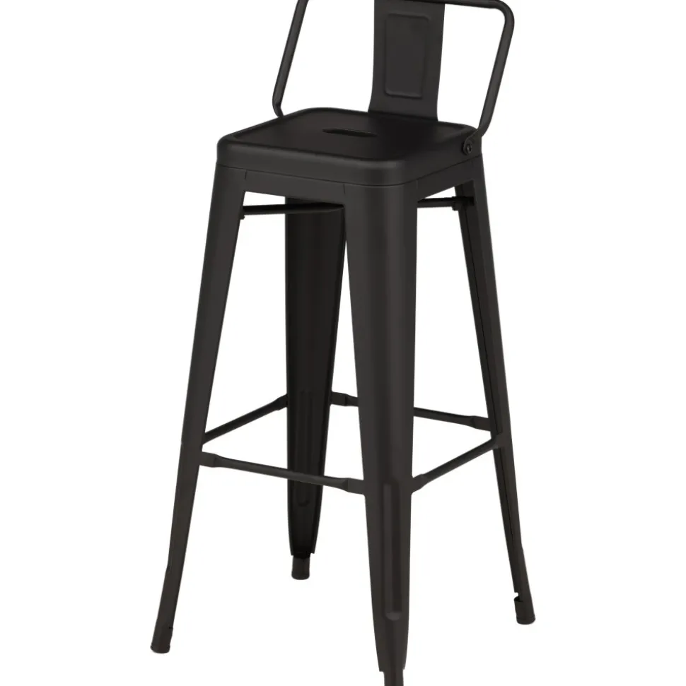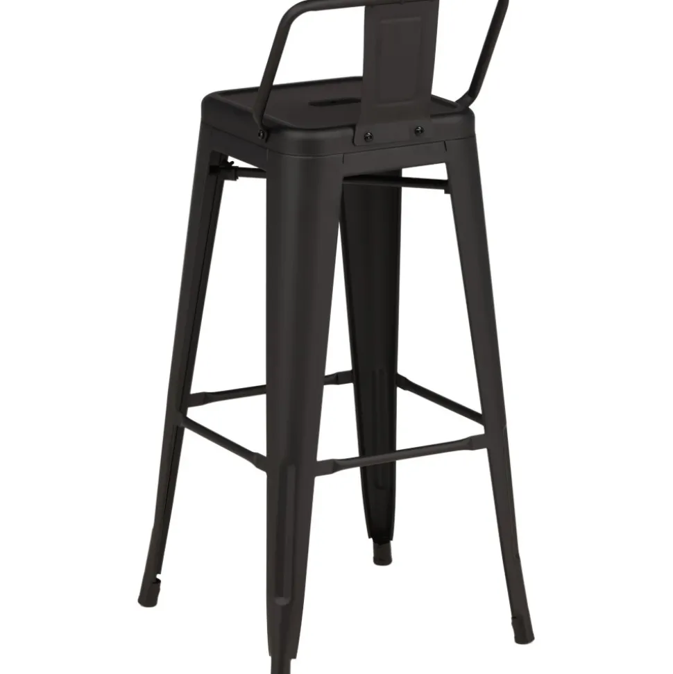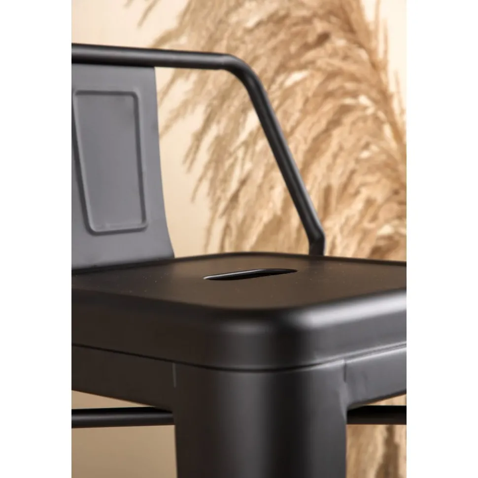 Barstol med en klassisk design av en högre pall med lätt utsvängda ben och sits med ett lägre ryggstöd i svart stål och en ram för fotstöd. Perfekt för dig med öppen planlösning i köket som önskar skapa plats för sittande sällskap när du lagar mat – eller varför inte kring ett högre matbord.