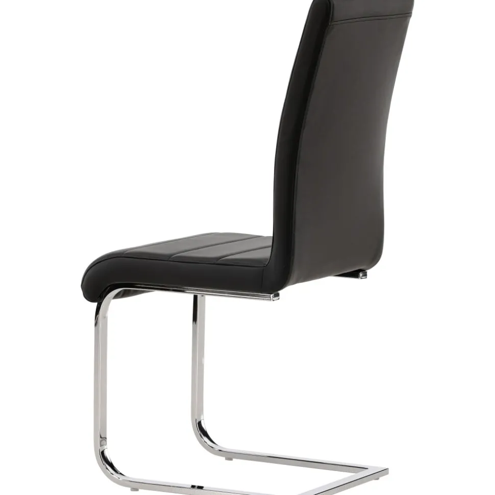 Matstol som har en trendig design med raka nordiska former och dekorativ stomme. Stolen är i svart konstläder med kromade metallben. Benens design gör att stolen sviktar behagligt och ger dig ett skönt gung. Matcha med ett pampigt matbord så får du en komplett matgrupp att pryda hemmets hjärta med!