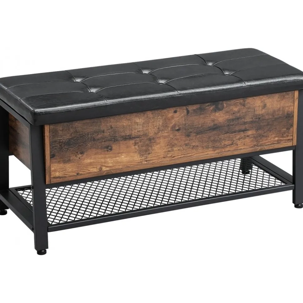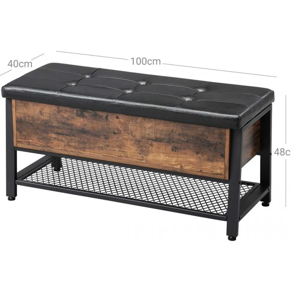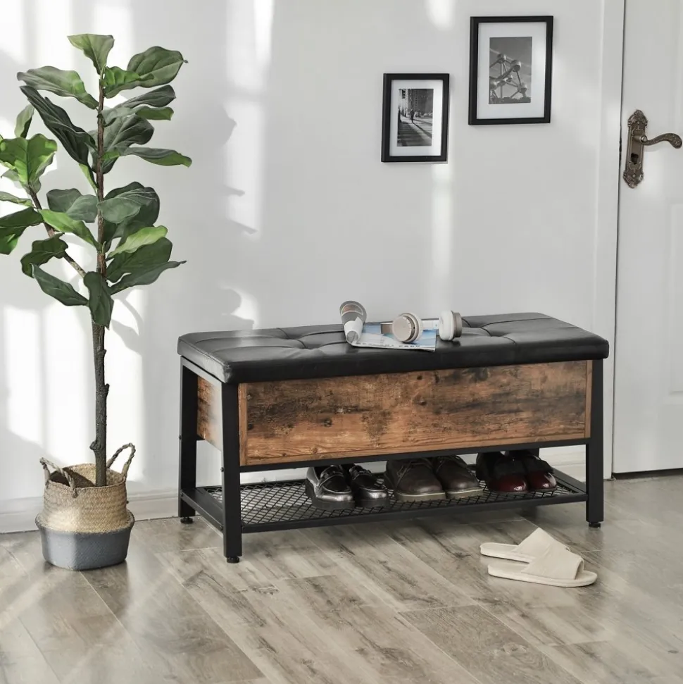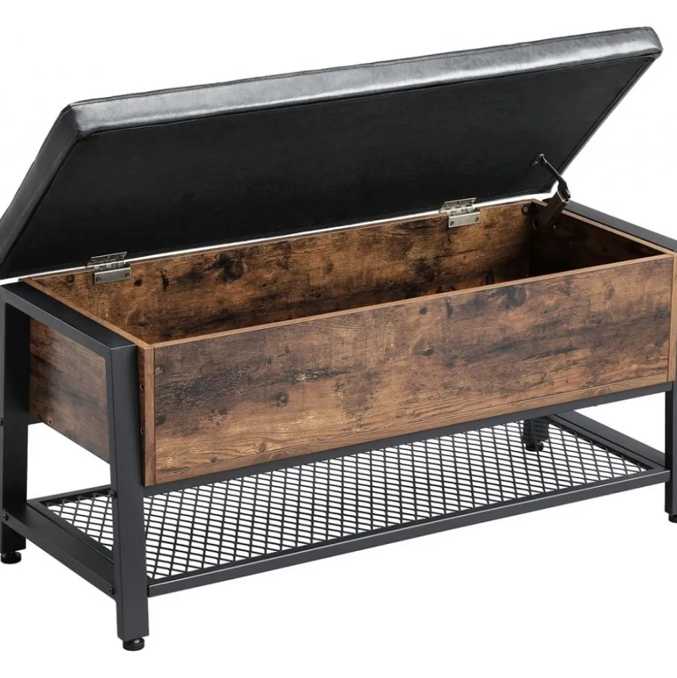 Hallbänk av trä och stål med klädsel av konstläder.