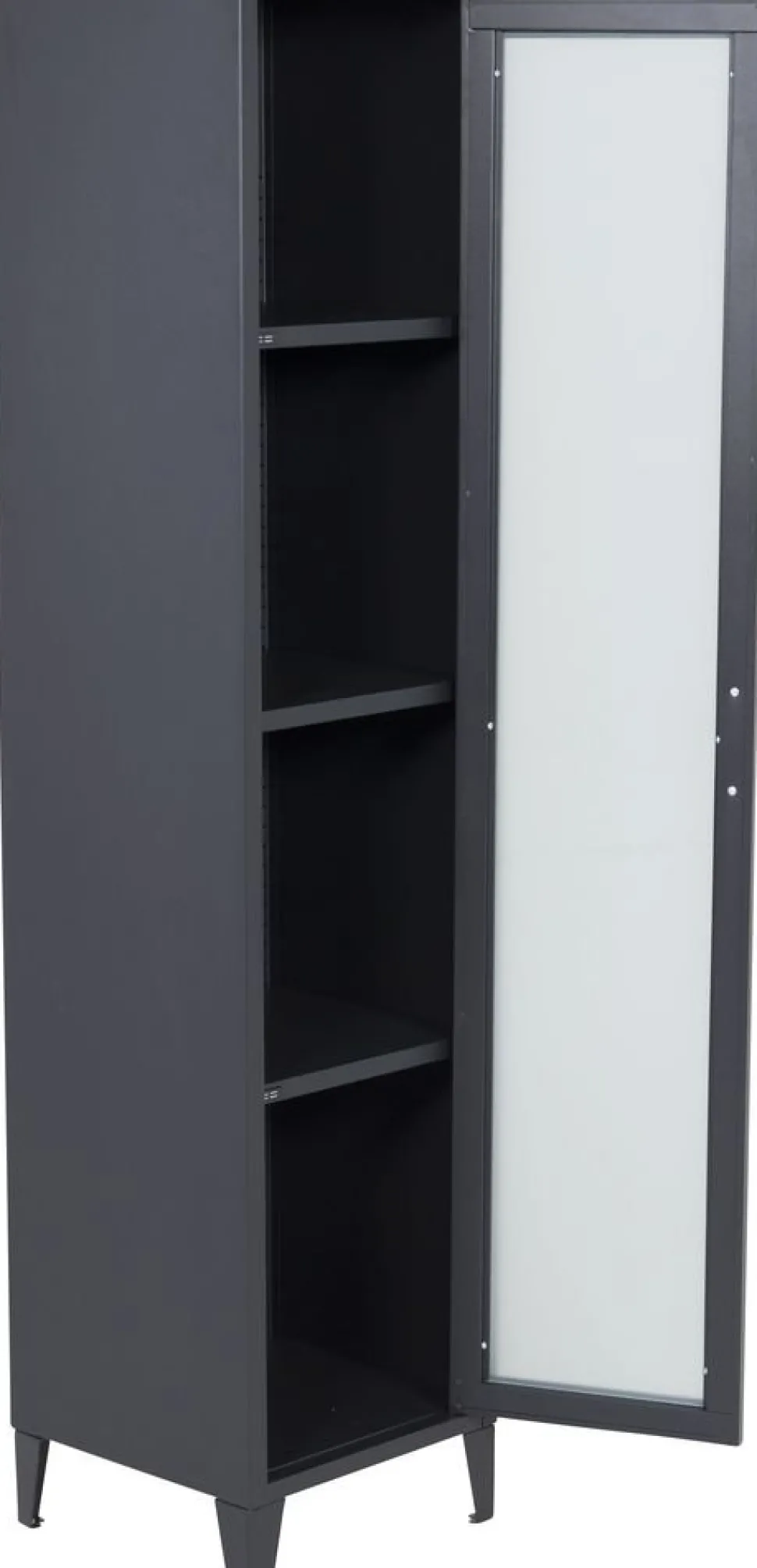 Torpa är en serie och sideboards i olika färger. Tillverkade av metall som pulverlackerats för ett stilrent uttryck. Detta skåp har mjölkfärgat glas i dörrarna och ett metallfärgat handtag.