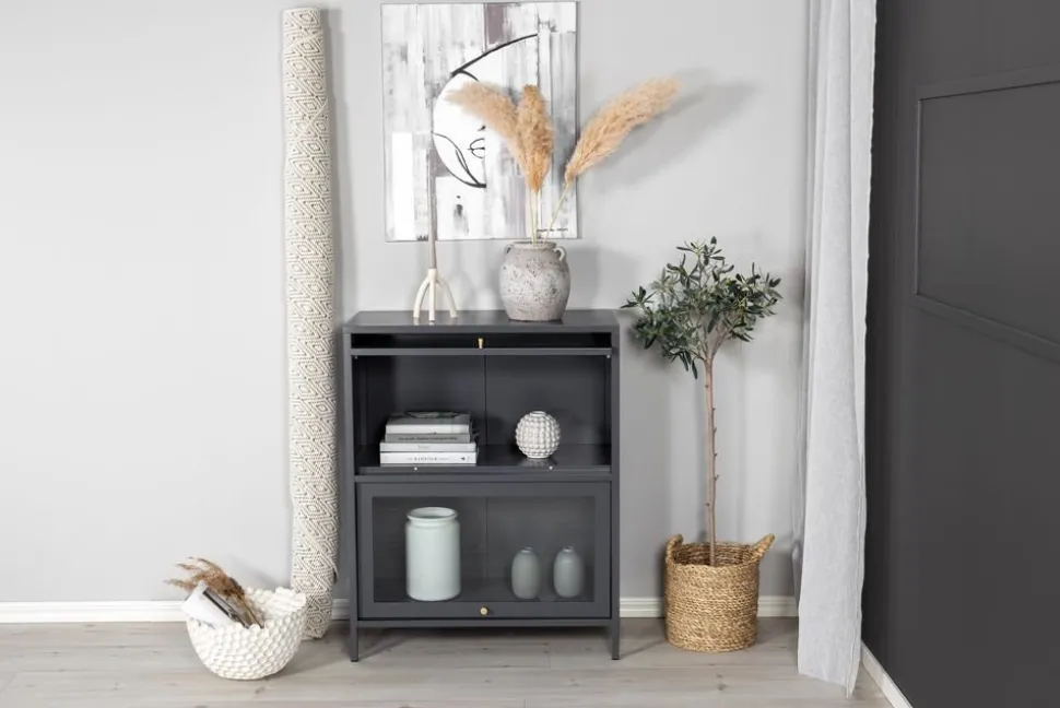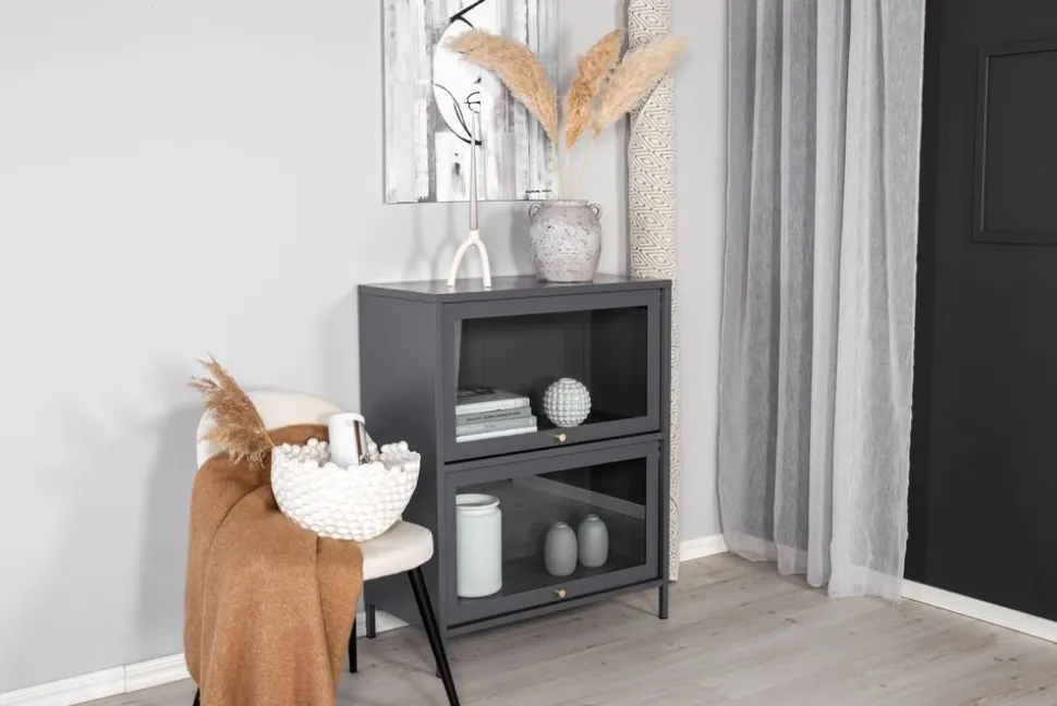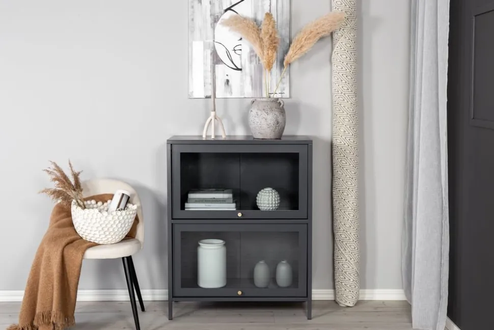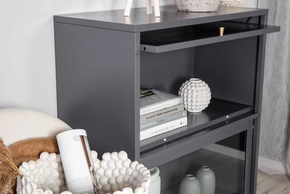 Torsnäs ger dig möbler i stilren design, olika färger på sängbord, vitrinskåp, skrivbord, soffbord och skåp. Tillverkade av hållbar metall som är pulverlackerad. Detta har två luckor, som öppnas i nederkant. Handtag av små knoppar.