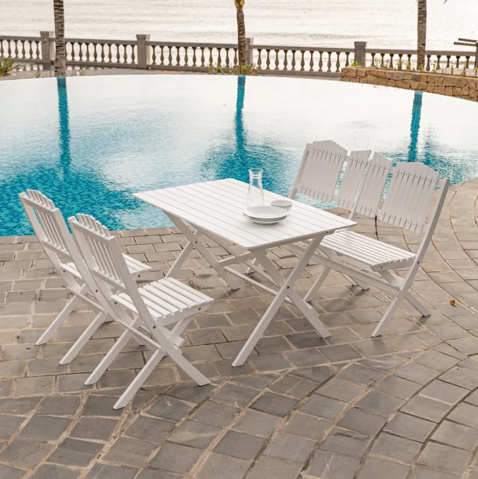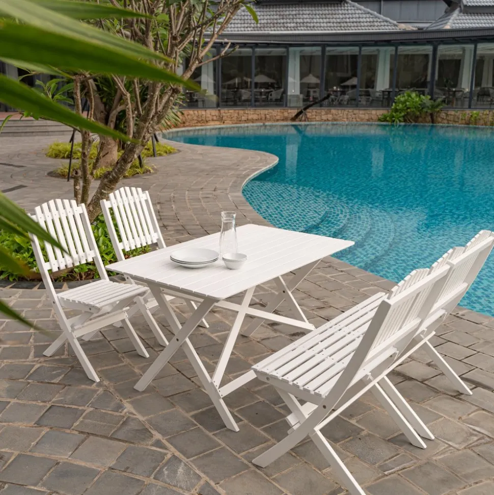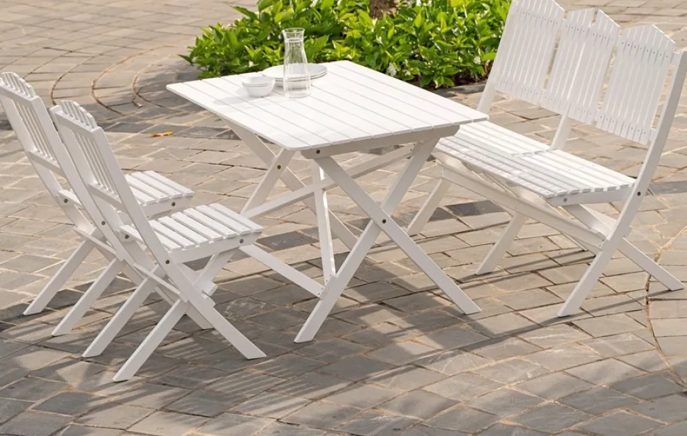 Trädgårdssoffa Haväng i klassisk vit färg, vikbar så den praktiskt kan förvaras undan när utesäsongen är över. Haväng finns även som komplett matgrupp med bord, stolar och .