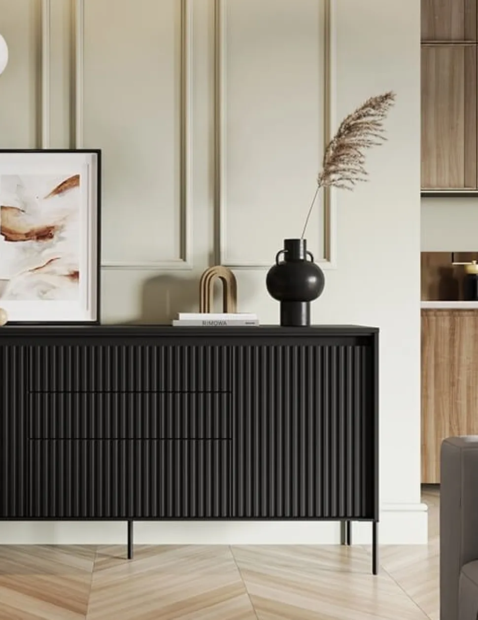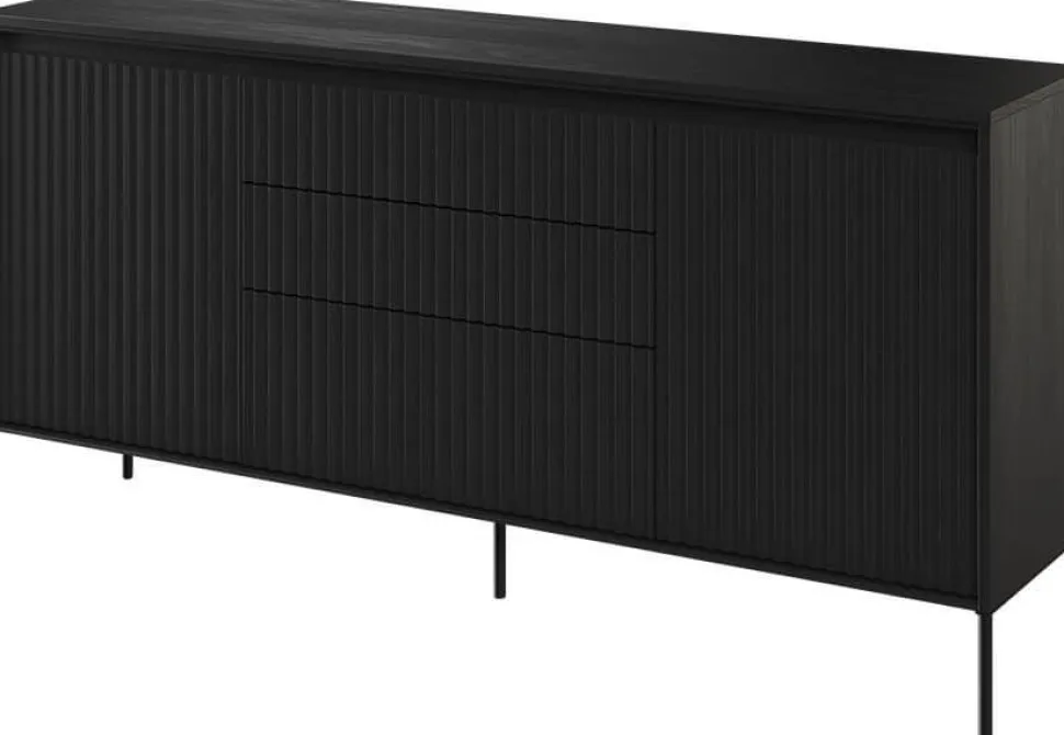 Skänk av laminerad spånskiva med LED-belysning och ben av metall. Levereras omonterad.