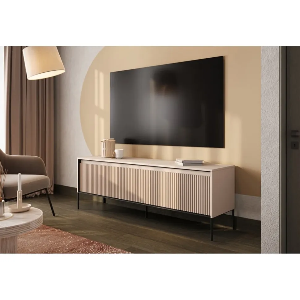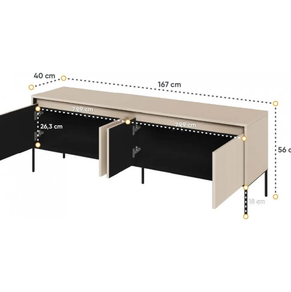 Mediabänk av laminerad spånskiva med LED-belysning och ben av metall. Levereras omonterad.
