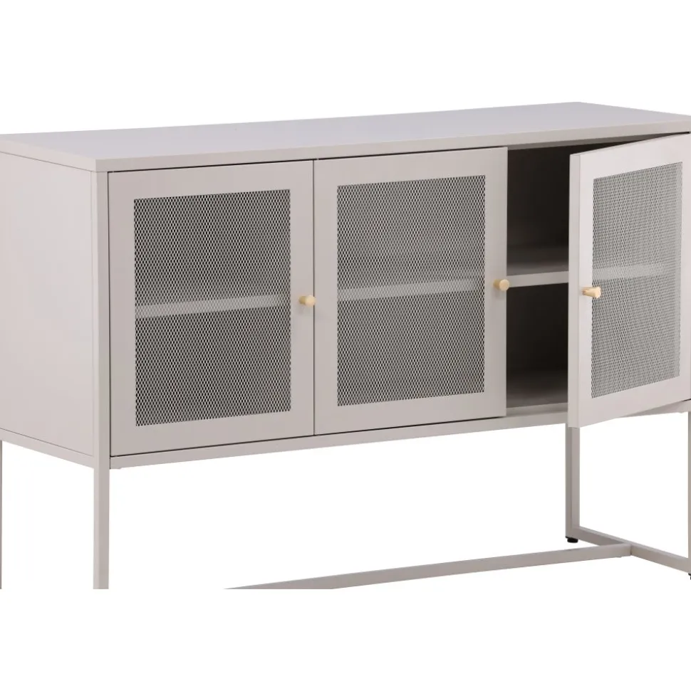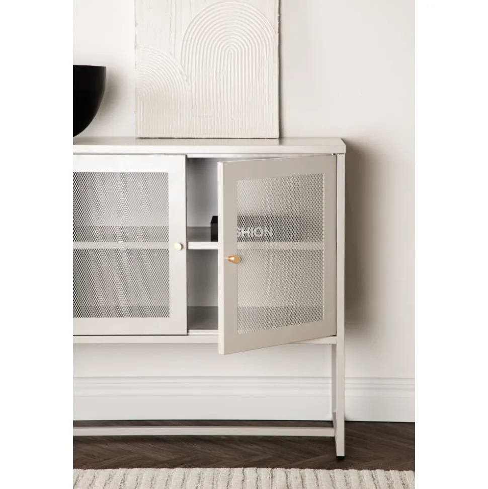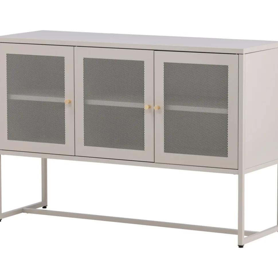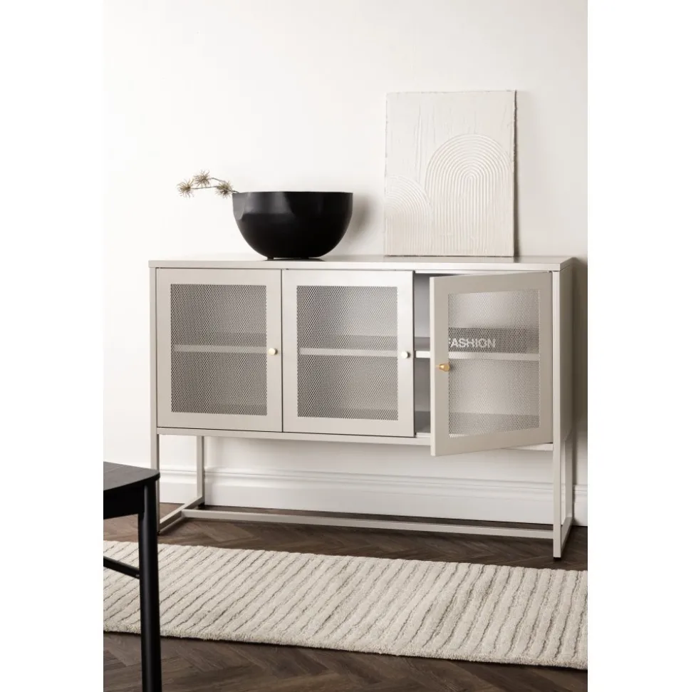 Trerike – ett modernt skåp i en tuff industriell design med läckra nätdörrar och ben tillverkade i beige pulverlackerad stål med 2 smarta hyllplan för avlastning. Skåpet lyfts upp av smala, höga ben som skapar en luftig känsla och underlättar även för dammsugaren. Den perfekta förvaringsmöbeln för allt du önskar – fyll med porslin, böcker eller vackra dekorationer. Skåpets smidiga storlek och eleganta utsida gör den lättplacerad och passar bra in i de flesta rum i hemmet, så möblera efter egna behov och önskemål.