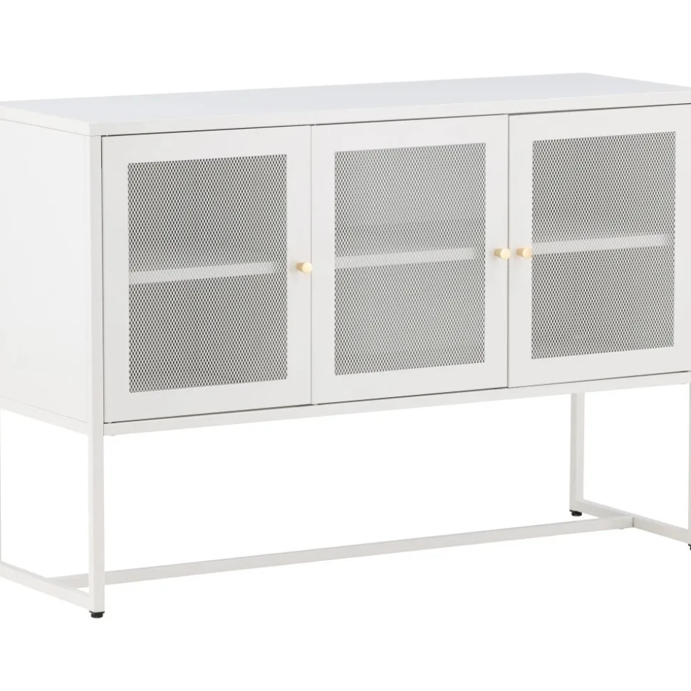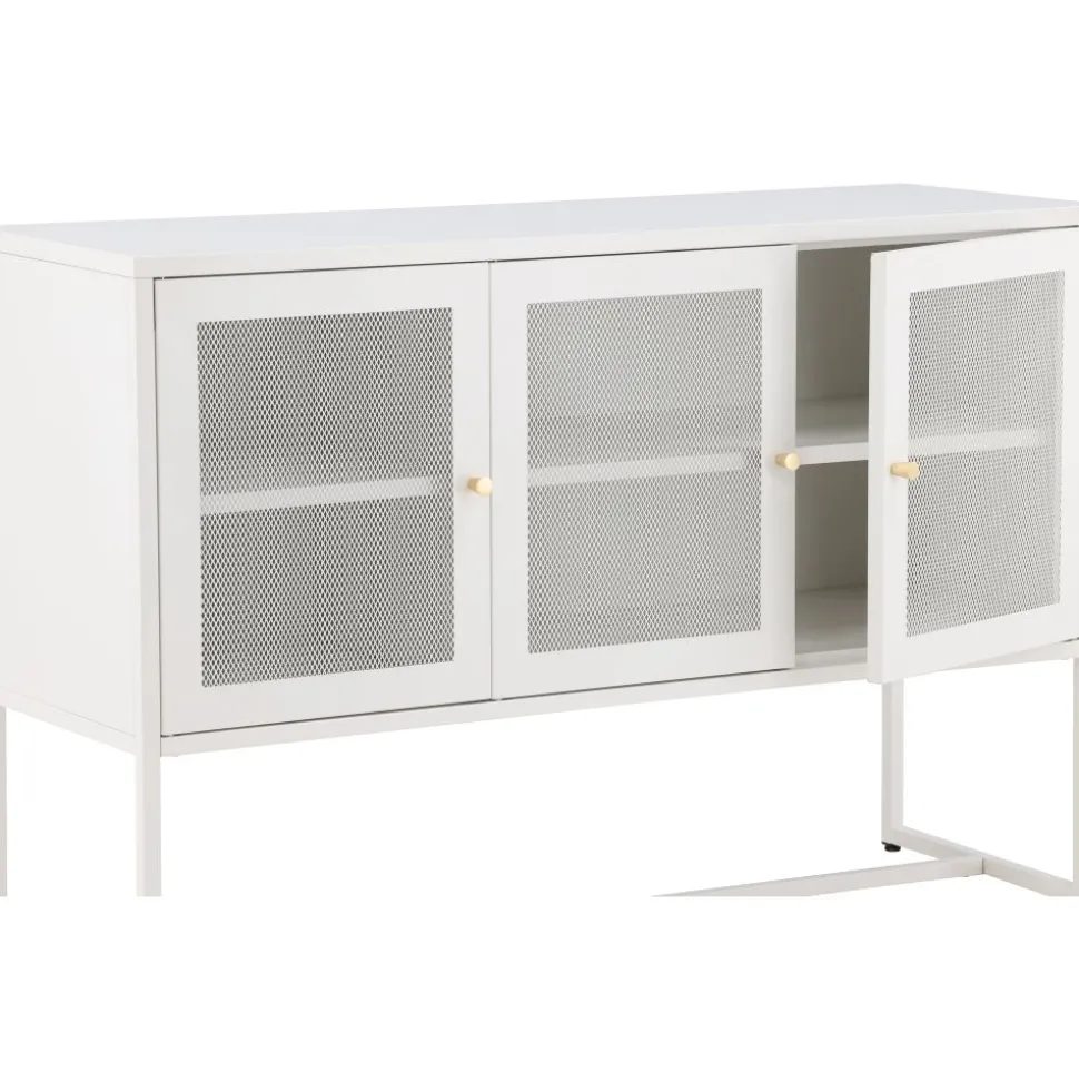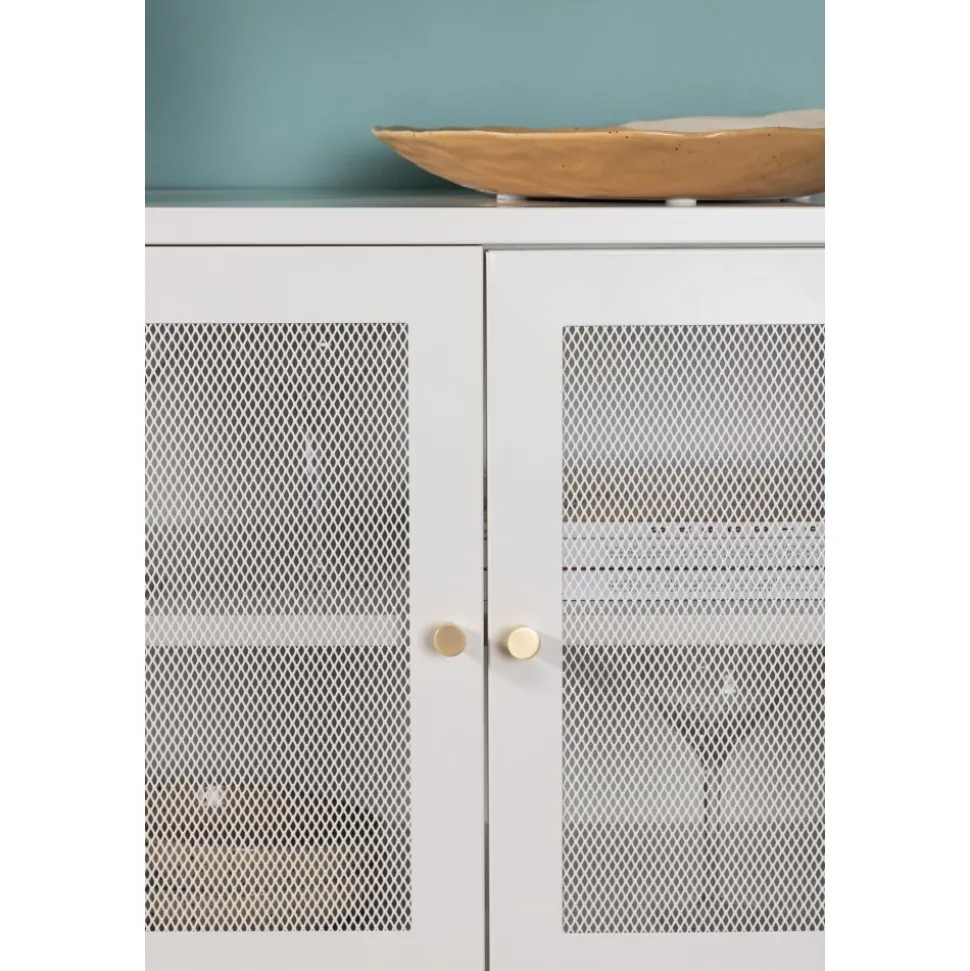 Trerike – ett modernt skåp i en tuff industriell design med läckra nätdörrar och ben tillverkade i vit pulverlackerad stål med 2 smarta hyllplan för avlastning. Skåpet lyfts upp av smala, höga ben som skapar en luftig känsla och underlättar även för dammsugaren. Den perfekta förvaringsmöbeln för allt du önskar – fyll med porslin, böcker eller vackra dekorationer. Skåpets smidiga storlek och eleganta utsida gör den lättplacerad och passar bra in i de flesta rum i hemmet, så möblera efter egna behov och önskemål.