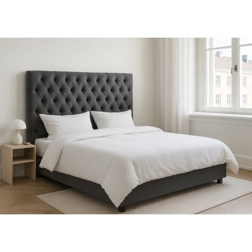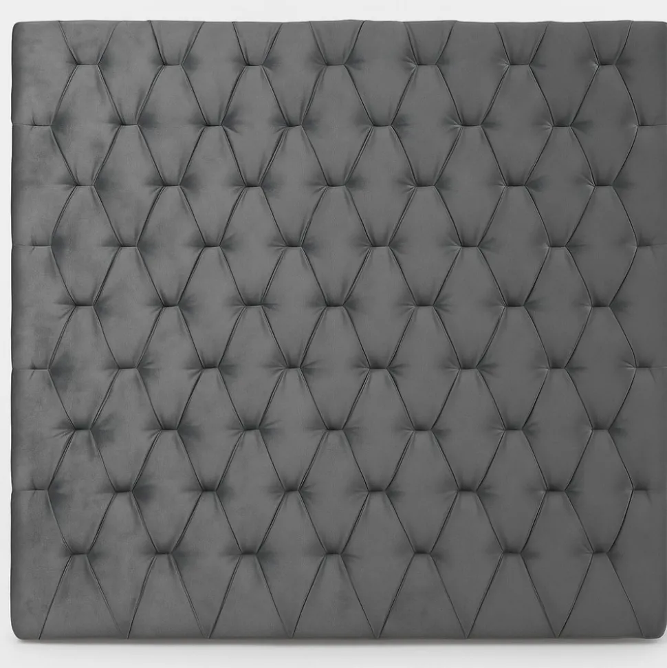 Ge sovrummet en lyxig och elegant känsla med denna djupknappade i exklusiv grå sammet. Gaveln har en klassisk, handtuftad design med mjuka, geometriska veck som skapar ett tidlöst uttryck. Det glansiga sammetstyget reflekterar ljuset vackert och ger en mjuk, inbjudande känsla.