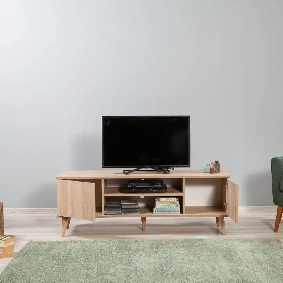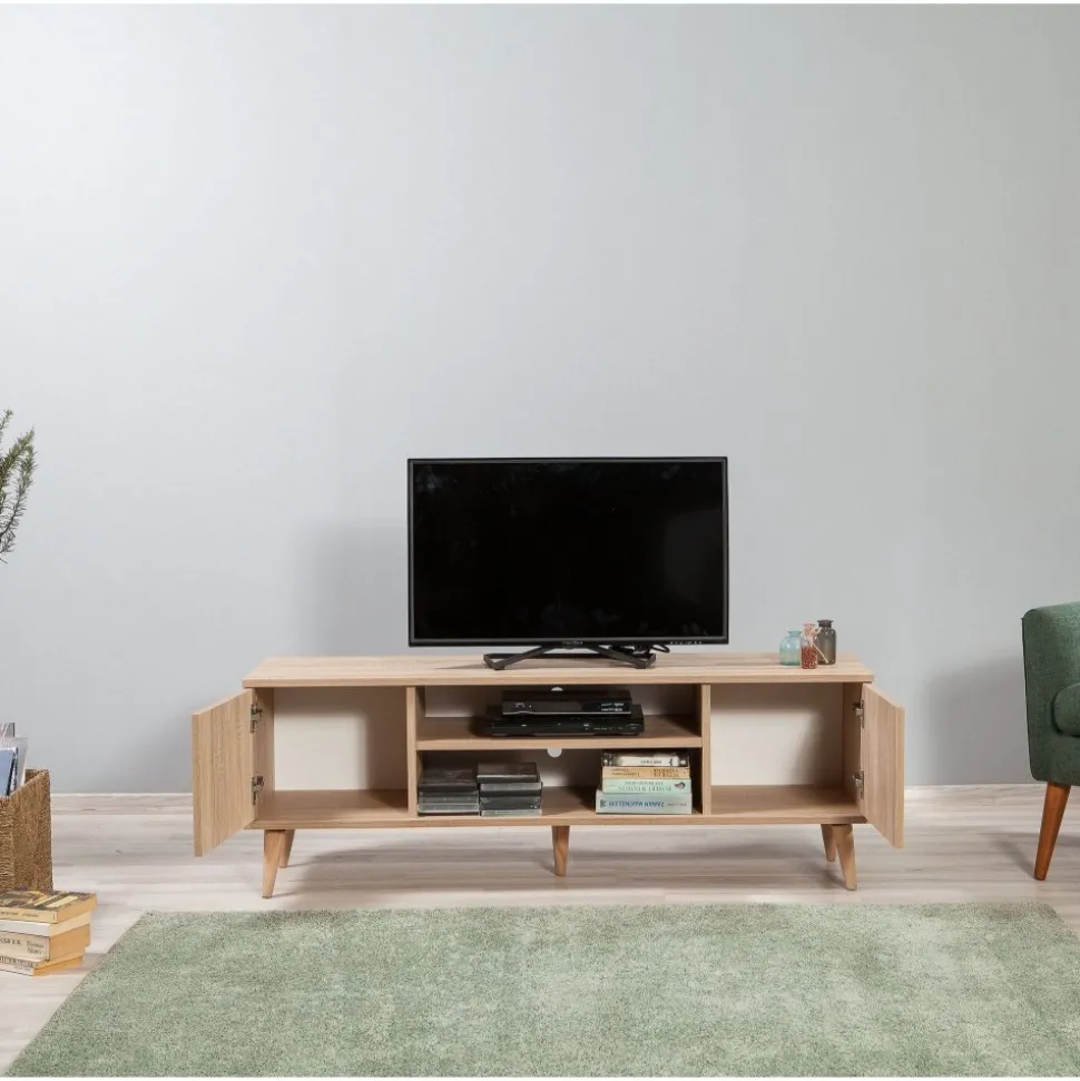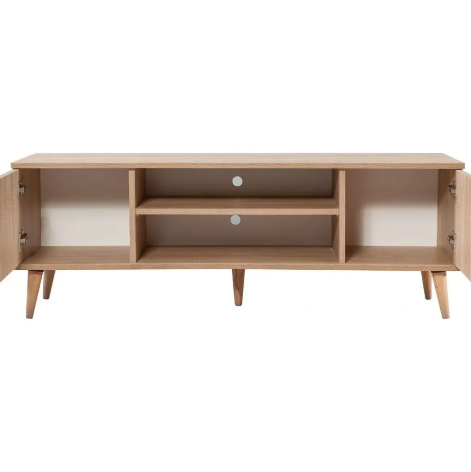Mediabänk av melaminbelagd spånskiva.