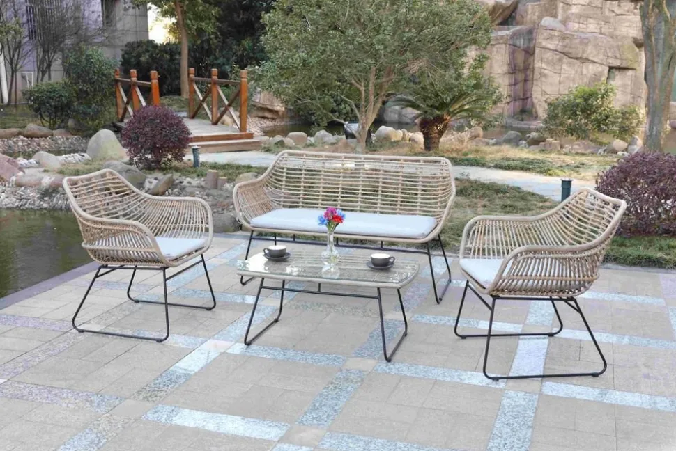 Hästevik är en modern soffgrupp i naturfärgad konstrotting med underrede i svart metall. Bordet har en toppskiva av 5 mm härdat glas.