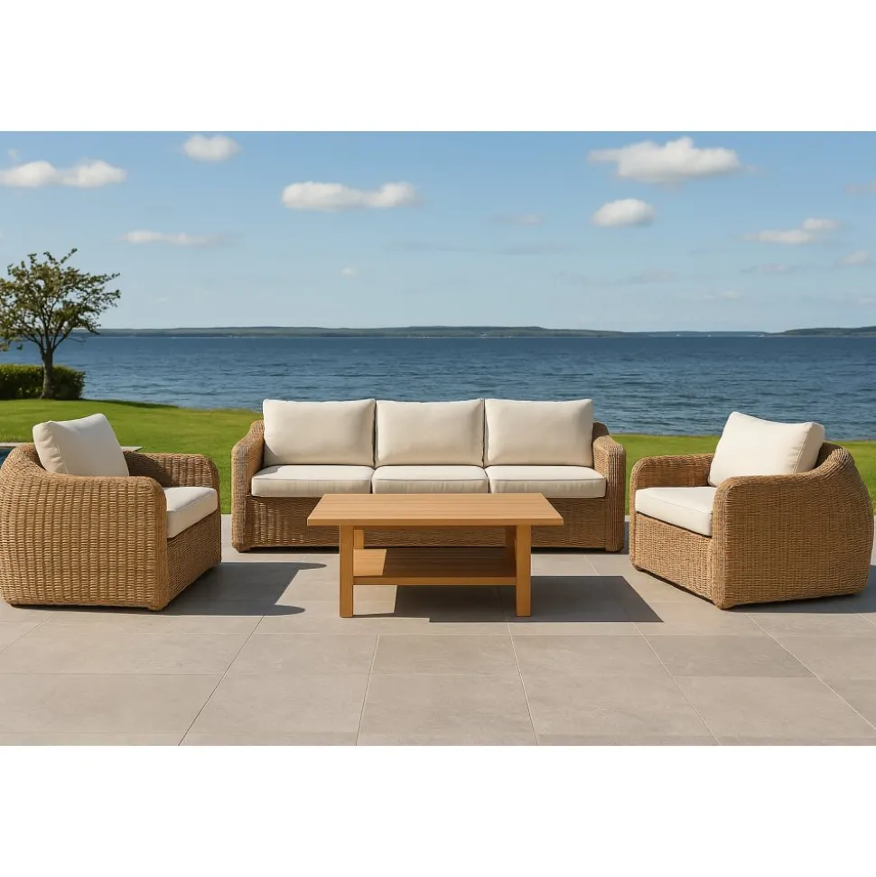 Malibu består av ett soffbord, en stor soffa och två fåtöljer, alla tillverkade av hållbar aluminiumstomme med klassisk naturfärgad konstrotting, både dubbelvävd halvrund och helrund. De ljusa dynorna är klädda i tyg som tål påfrestande väder och skapar en elegant och inbjudande atmosfär.