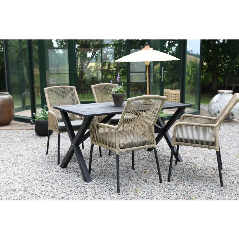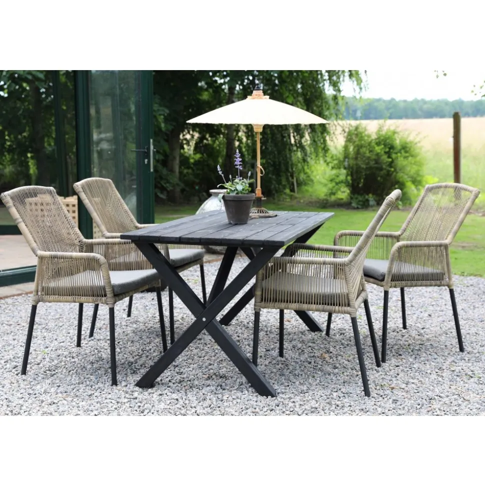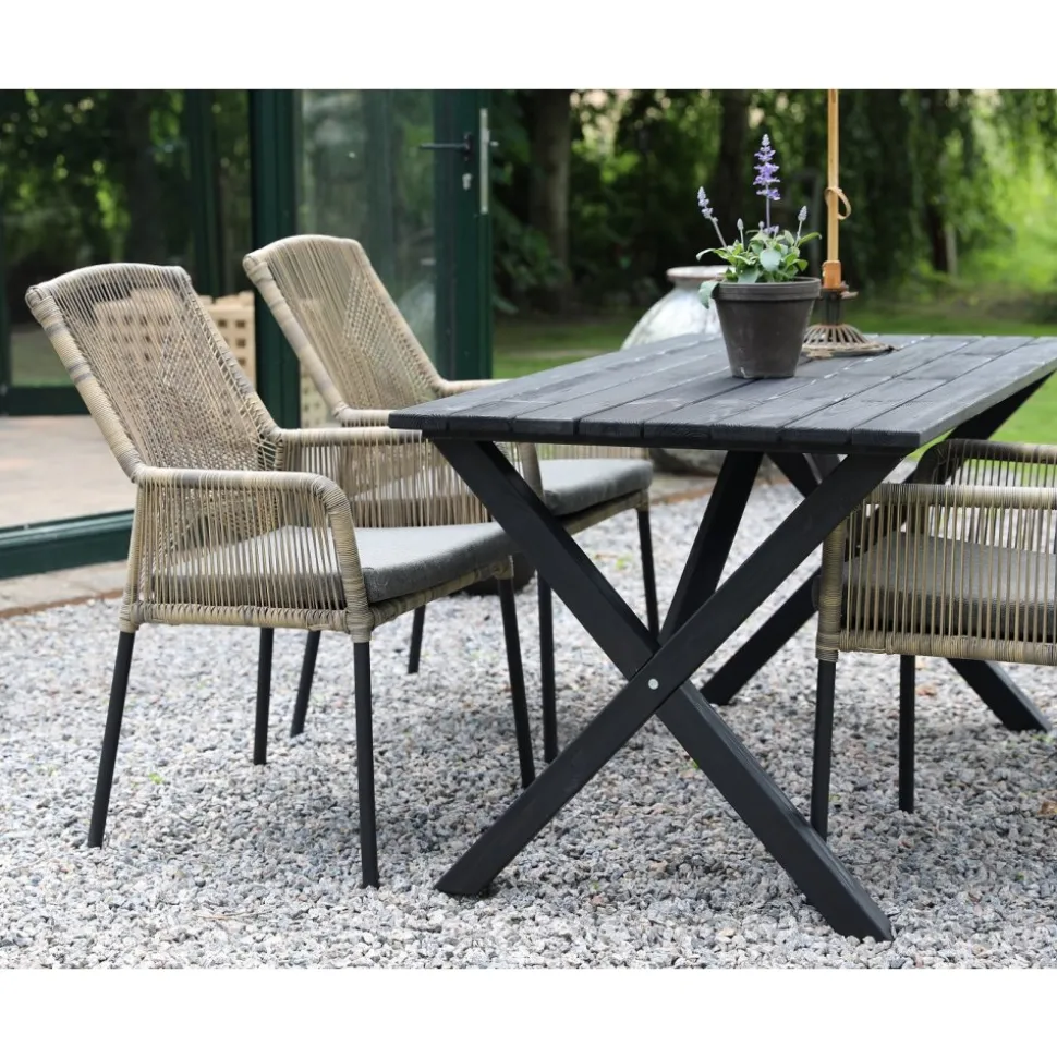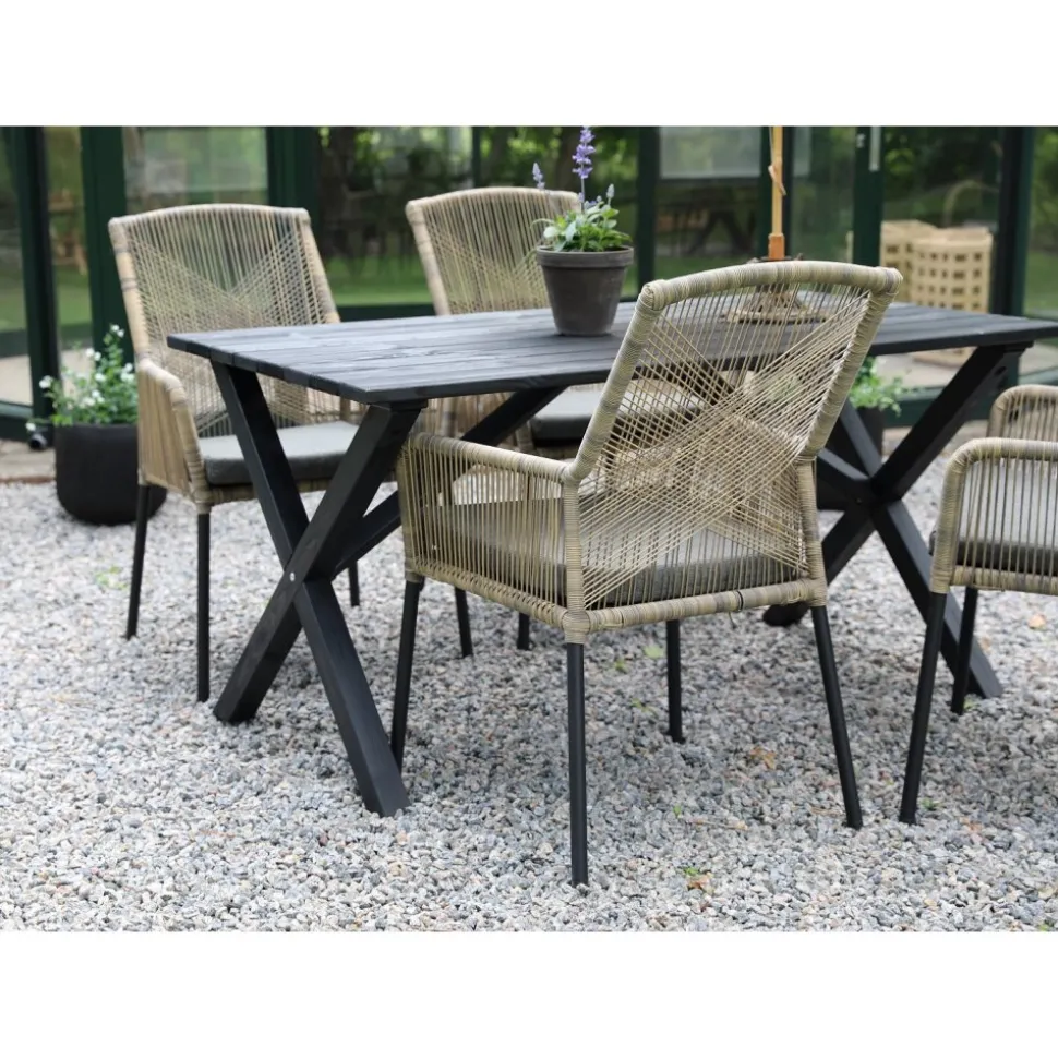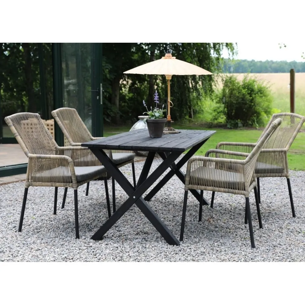 Scottsdale matgrupp för uteplatsen med ett rektangulärt robust matbord, tillsammans med Ystad karmstol med beige tvinnad konstrotting och en grå skön sittdyna. Bordet är tillverkad i svartlaserad furu vilket gör utegruppen väderbeständig och tålig för att klara uteplatsens miljö.