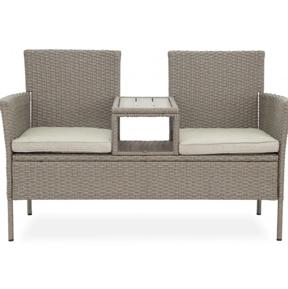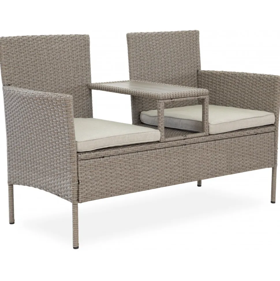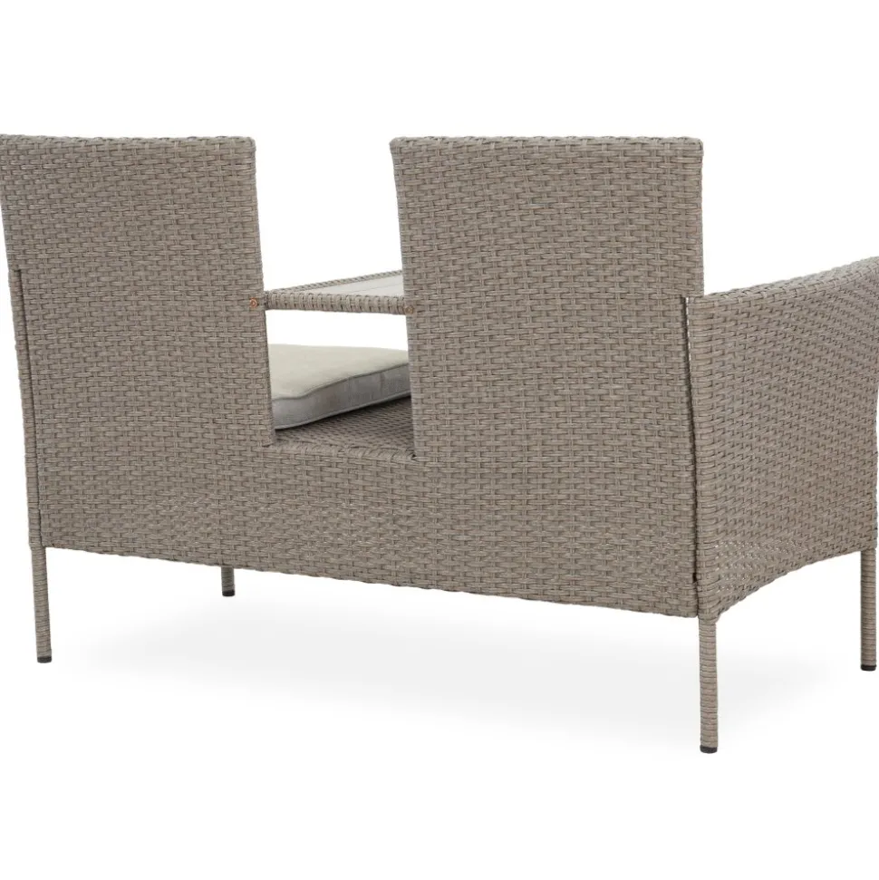 Duosoffa för två personer med ett smidigt sidobord mellan sätena. Naturfärgad konstrotting med beige matchande dynor i 230 grams tyg. Smidig trädgårdssoffa för soliga dagar. Bordstopp i nonwood.
