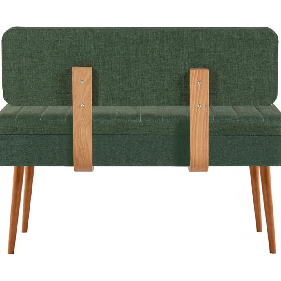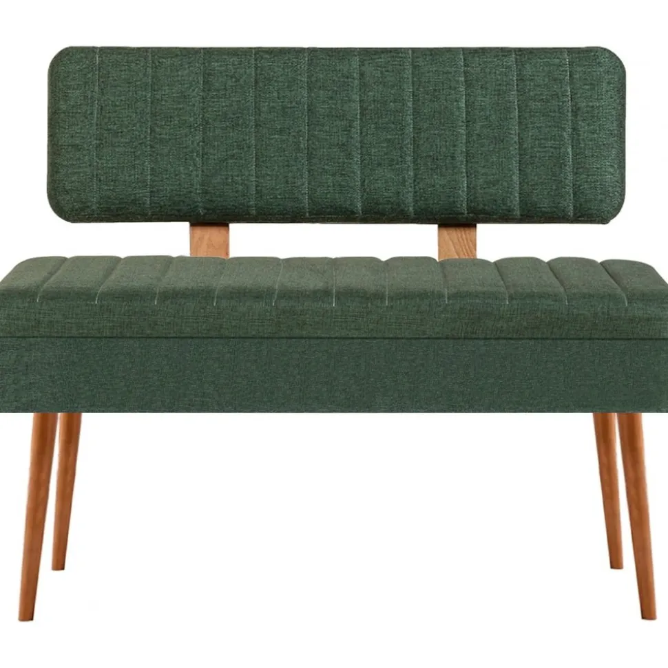 Sittbänk av trä med klädsel av linne.
