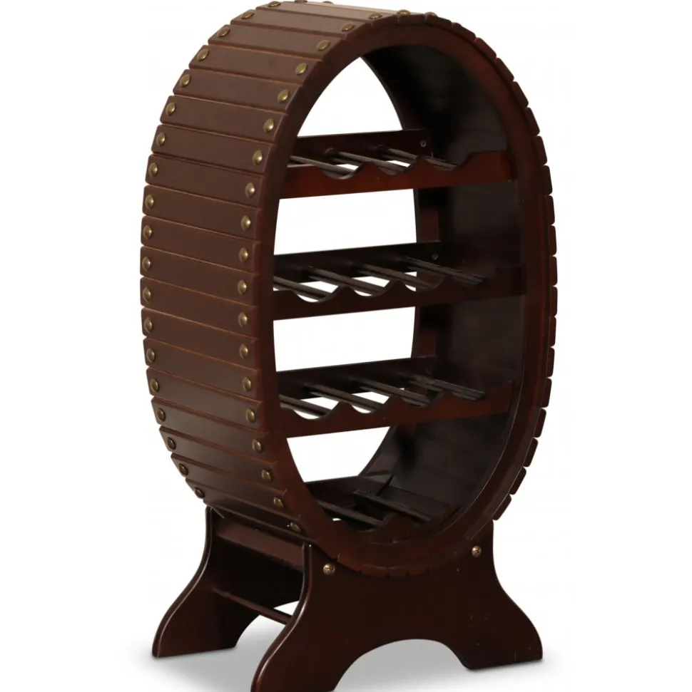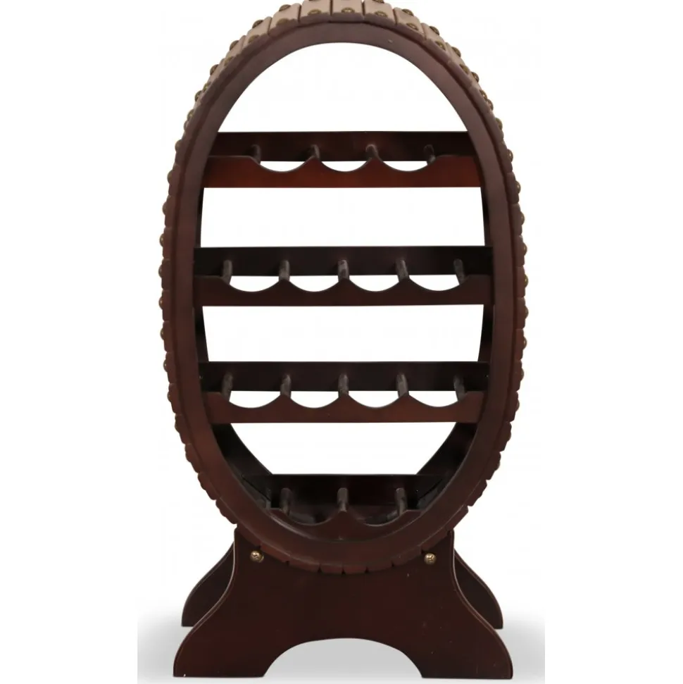 Vinställ i oval form, tillverkat av MDF i brunt utförande. Ett dekorativt med plats för en mindre vinsamling.
