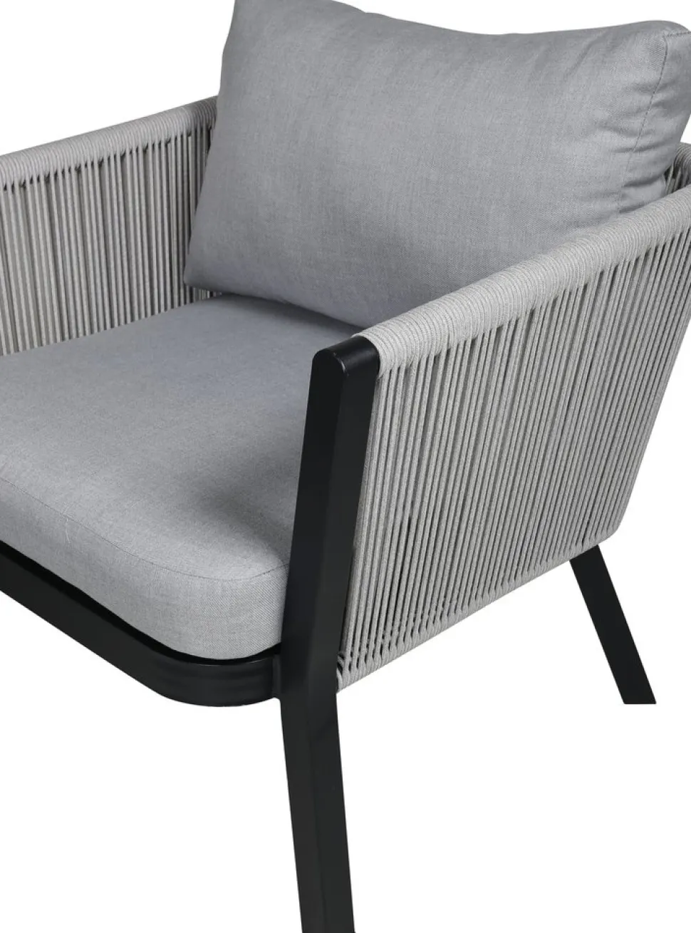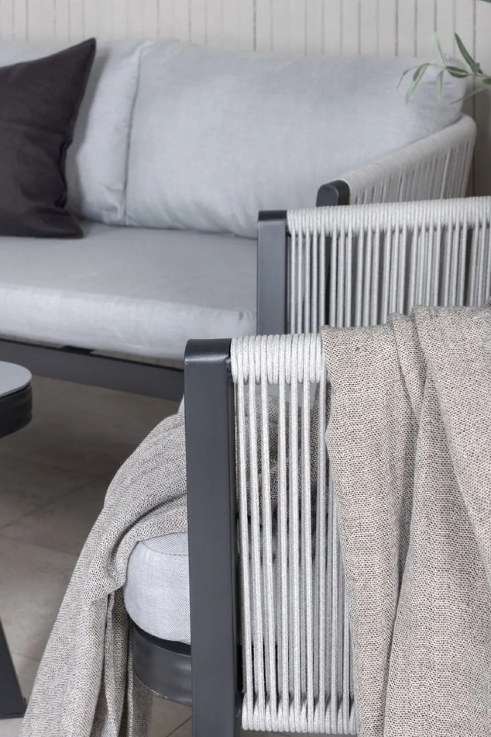Virya är en modern med inriktning på komfort – den passar perfekt på uteplatsen eller altanen. Möbelgruppen består av en tvåsitssoffa, två karmfåtöljer tillverkad i svart pulverlackerad metall med en rygg som är designad i ljusgrått rep. Inkluderat i gruppen är ljusgrå mjuka dynor samt ett rektangulärt lågt soffbord med en bordsskiva i grå finish som matchar repen och dynornas nyans och skapar en exklusiv helhet. Njut av bekväma sommarkvällar i en trivsam soffgrupp! Skötselråd: Våra rep är kvalitetsspunna polyesterrep som är lätta att rengöra. Möblerna är behandlade för att klara 500-2000 timmar. Vi rekommenderar såpa och vatten för rengöring. Låt lufttorka.