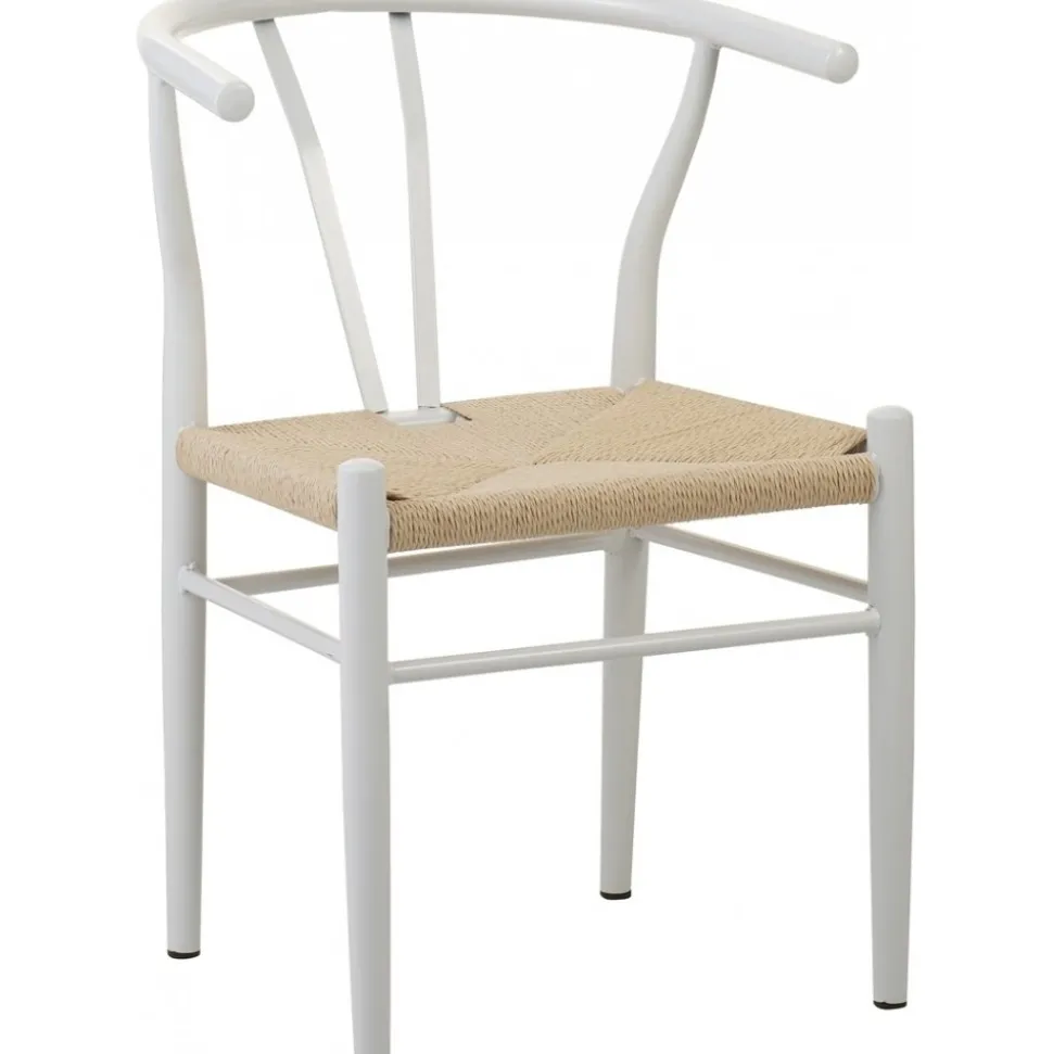 Denna snygga med klassisk design är tillverkad av lackad vit metall, vilket ger den ett stilrent och tidlöst utseende. Det slitstarka repsitset ger en unik textur och bra sittkomfort, vilket gör att stolen passar perfekt för både vardagsbruk och festligare tillfällen.