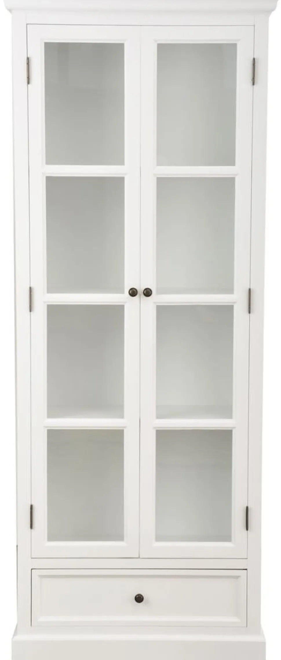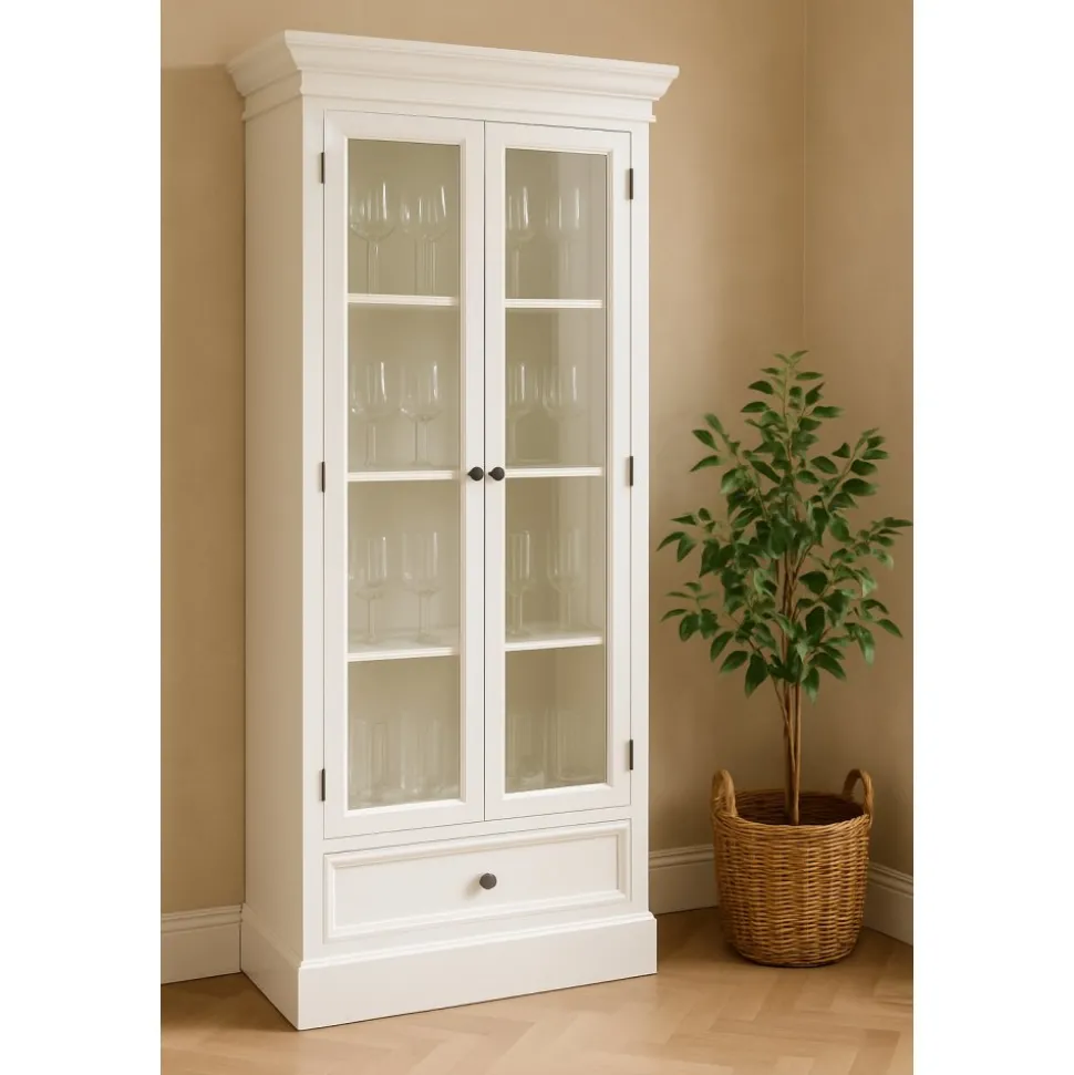Vitrinskåp i antikvitt med 2 dörrar i härdat glas, 3 hyllplan samt en låda nertill. Ytskiktet på möbeln är behandlat för att ge ett vintage uttryck och har således lite märken och små skavanker. Färgskiftningar, märken, lagningar och småsprickor hör till dess unika utseende.