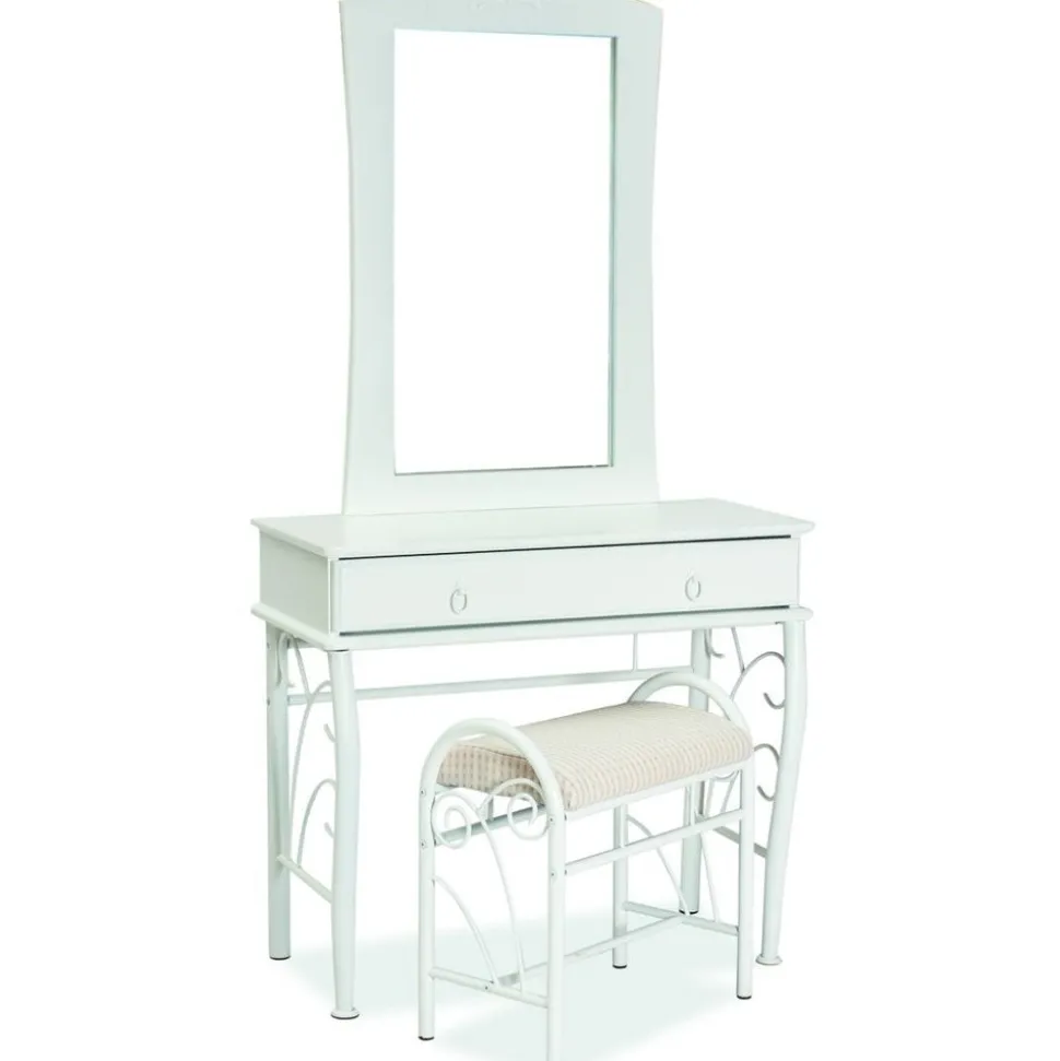 Ett snyggt med en klassisk design. Stommen är tillverkad av vitlackerad metall och bordet är av vitlackerad MDF med stor låda för förvaring och . Pallen ingår i köpet och är av vitlackerad metall med klädsel av mycket behagligt tyg för maximal komfort.
