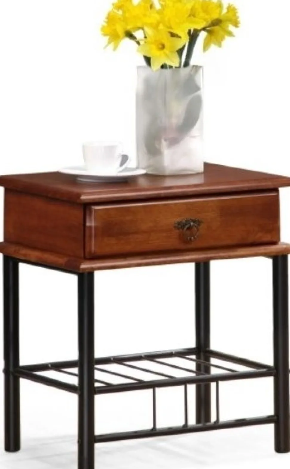 Stilfullt med en klassisk design. Underredet är tillverkat i svartmålad metall med ett praktiskt hyllplan för förvaring av tidningar och böcker. Bordstoppen är tillverkat i massiv trä med ett härligt utförande av antik körsbärsträ, men en praktiskt låda för förvaring.