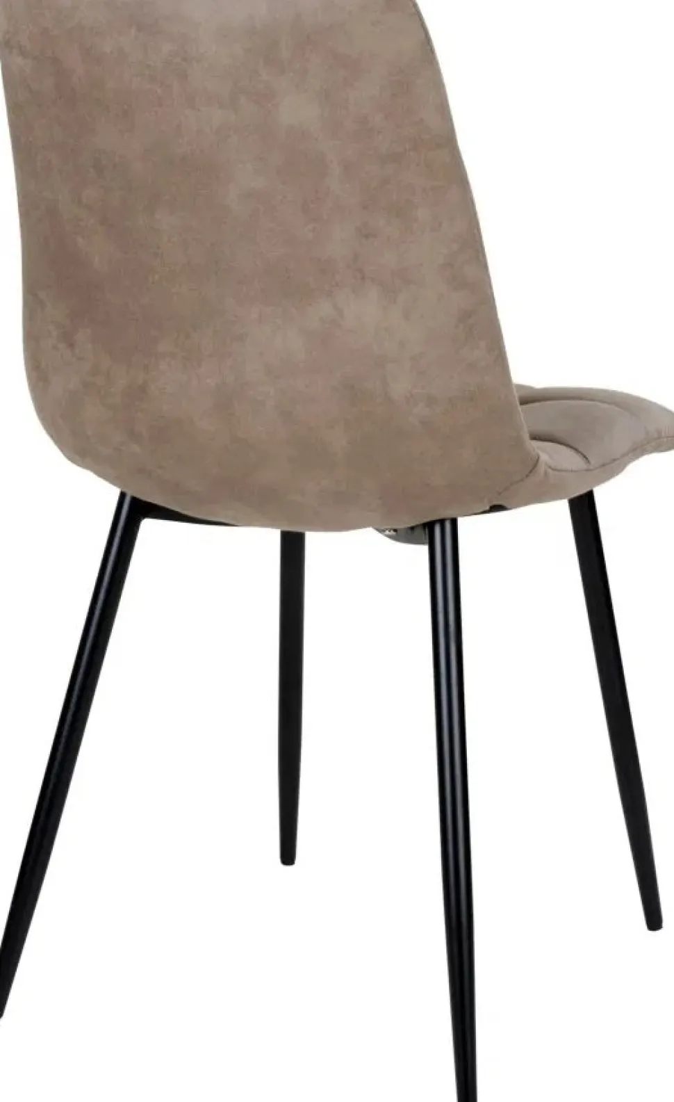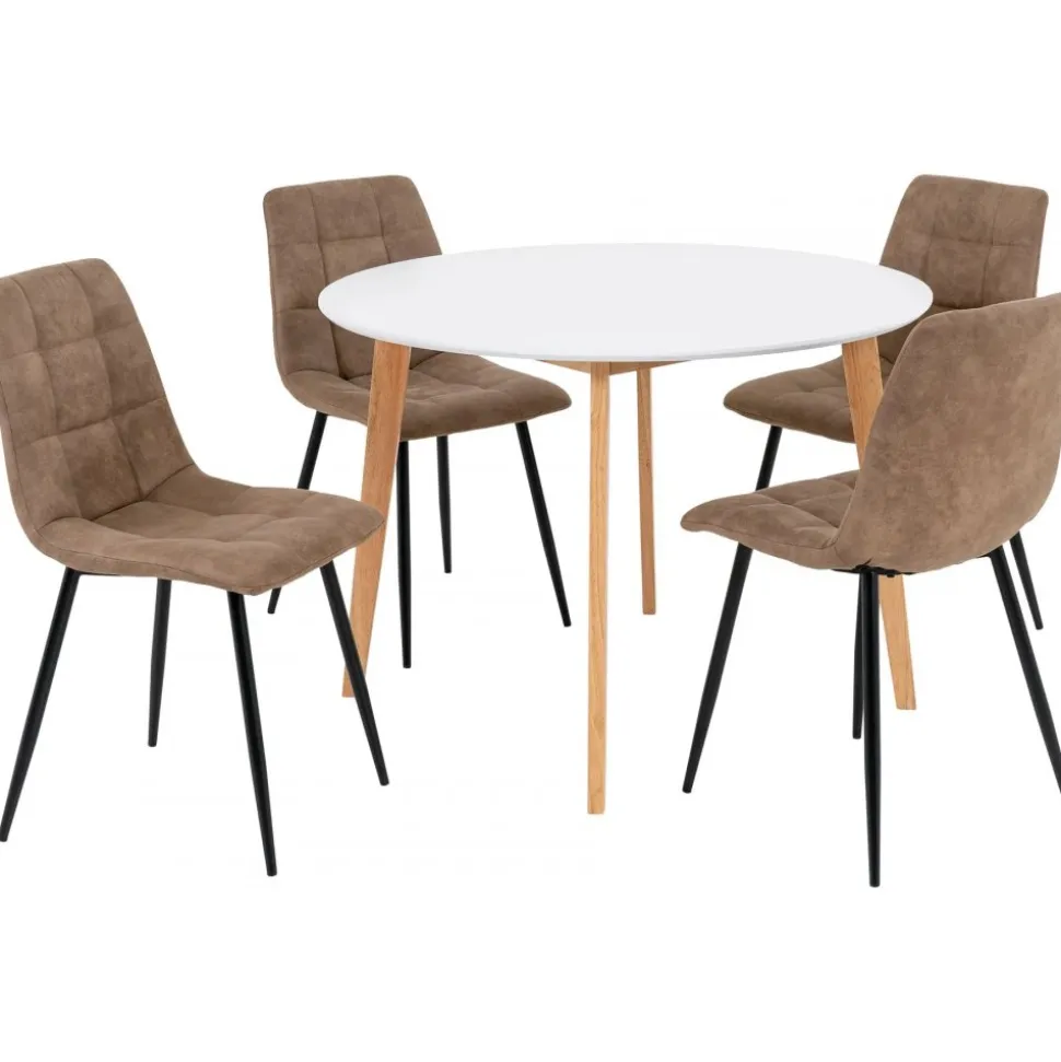 Matgrupp bestående av i vitt med träfärgade ben och 4 st i ljusbrunt microfibertyg. Levereras omonterad.