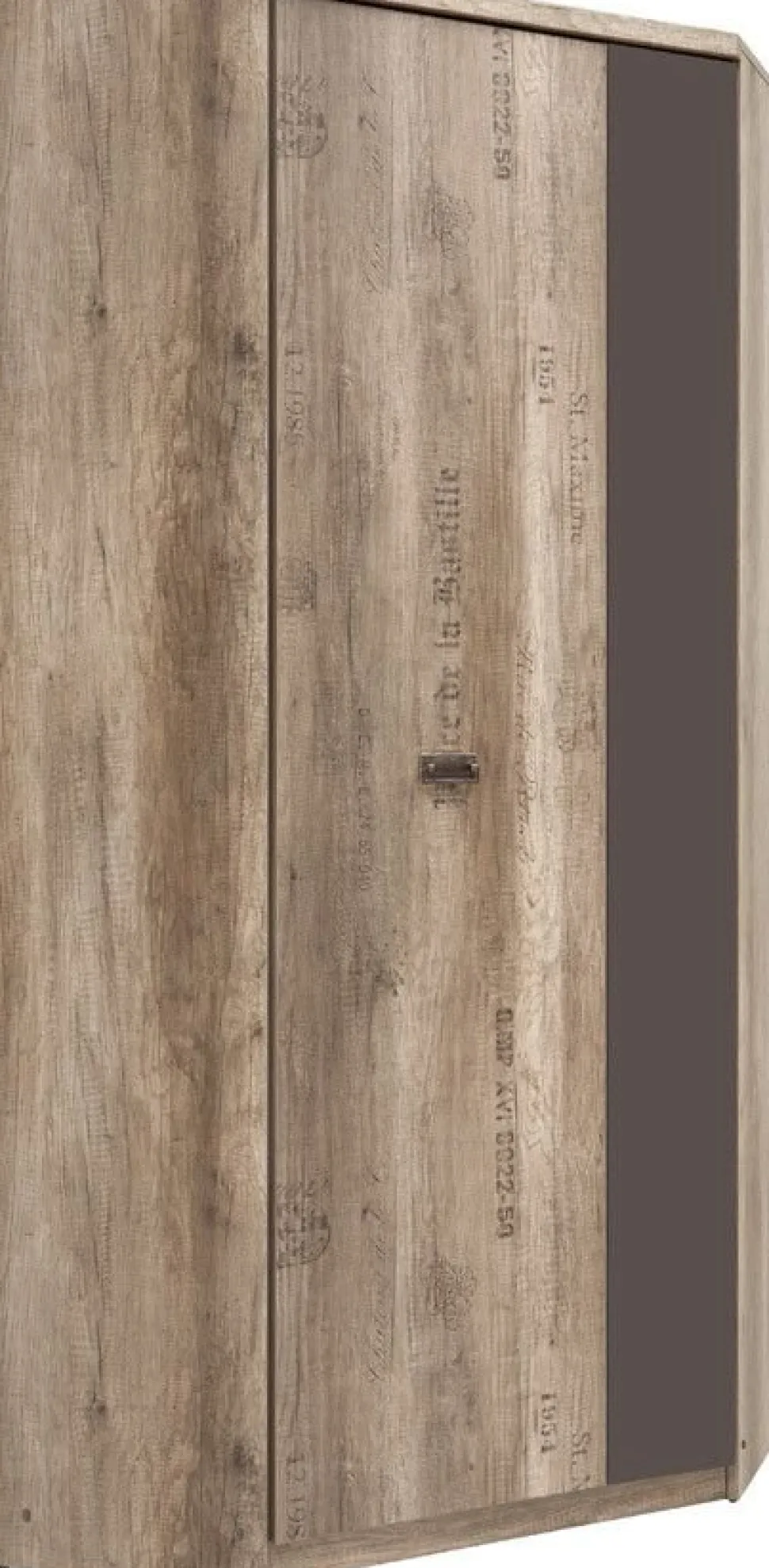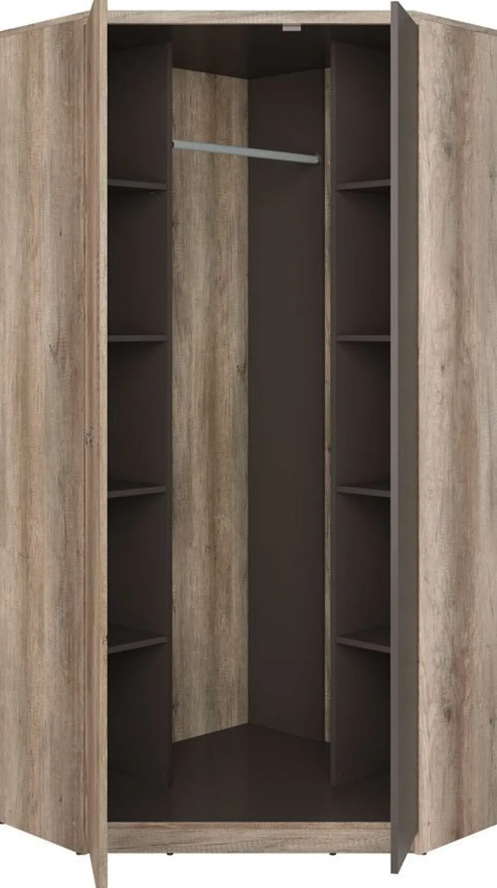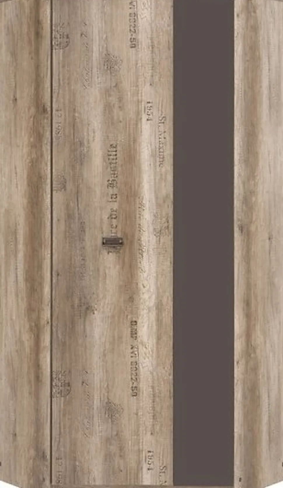 En fin garderob i ek med dubbeldörrar där den smala dörrfronten i grått. Garderoben är mycket rymlig och smart inredd med en klädstång och många hyllplan. En hörngarderob är praktisk eftersom man kan ta vara på rummets alla vinklar och vrår. Man kan med fördel sätta ihop garderoben med andra ur samma möbelserie för att få den ultimata klädförvaringen. Som en fin detalj finns det diskreta grafiska ord och siffror på möblerna som en röd tråd genom hela möbelserien.