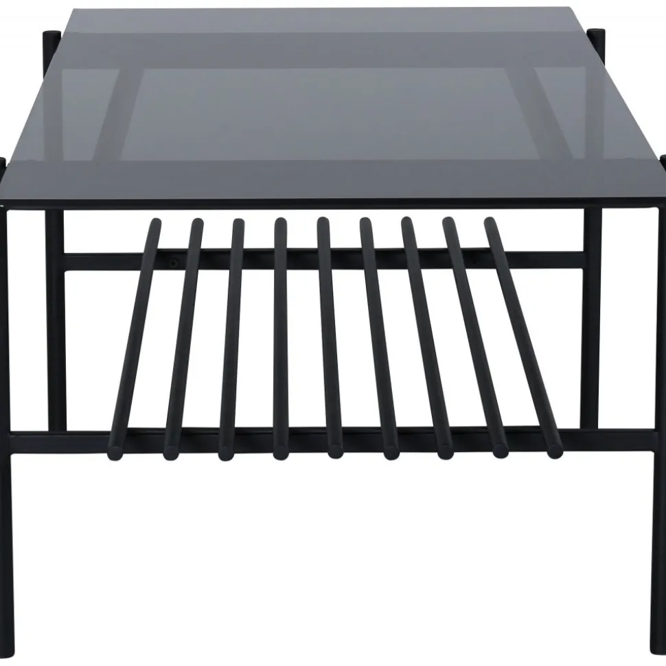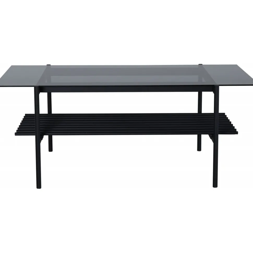 Soffbord av metall och rökfärgat glas.