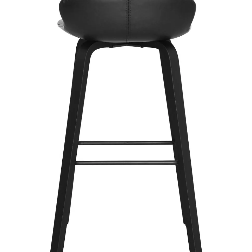 Barstol med svart PU-klädsel, svartlackade träben och metallfotstöd.