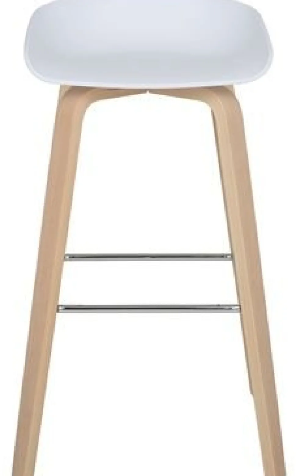 Stilren i ljust format med den vita sitsen i PP plast och underrede i vitpigmenterad och vaxlackad ek. Fotstöd i metall att vila fötterna på, både fram, bak och på sidorna.