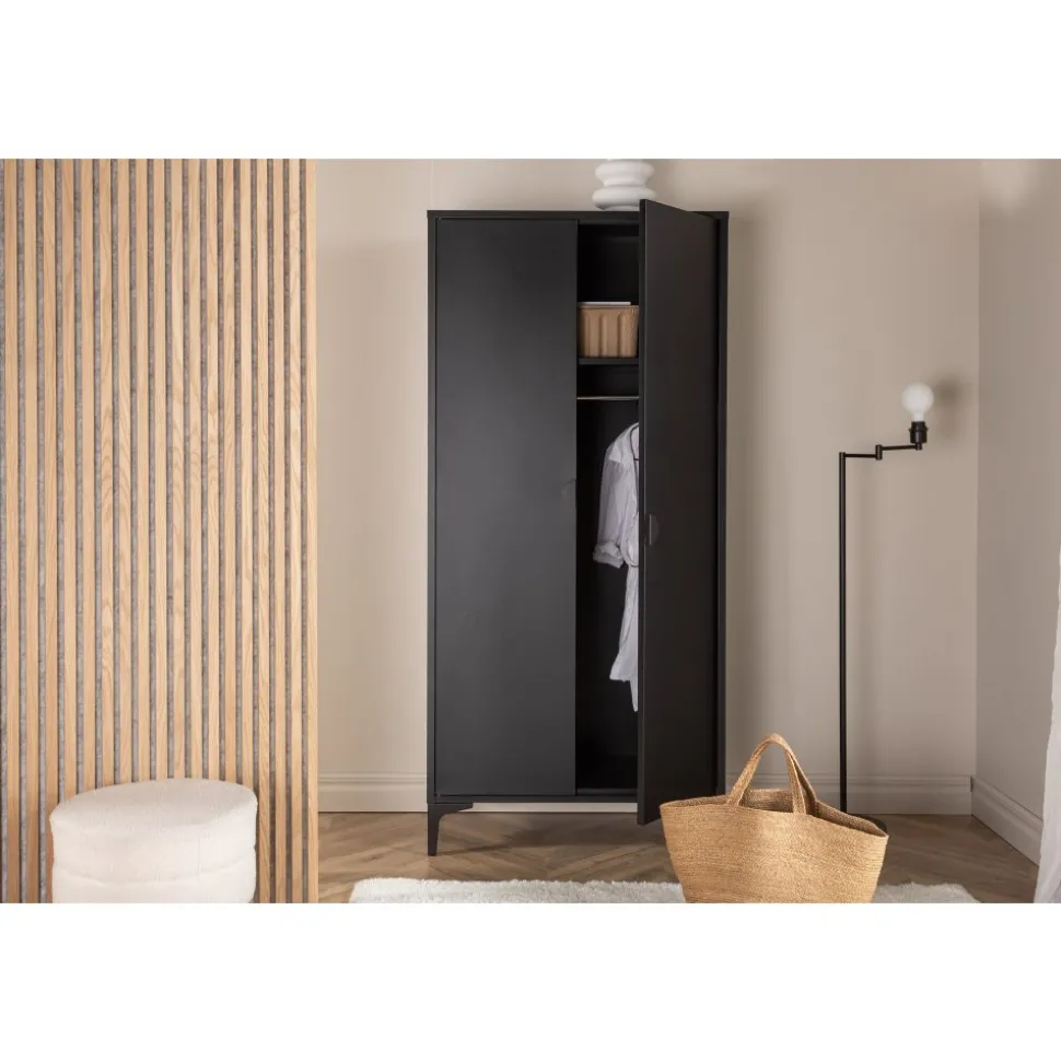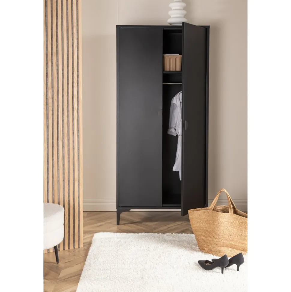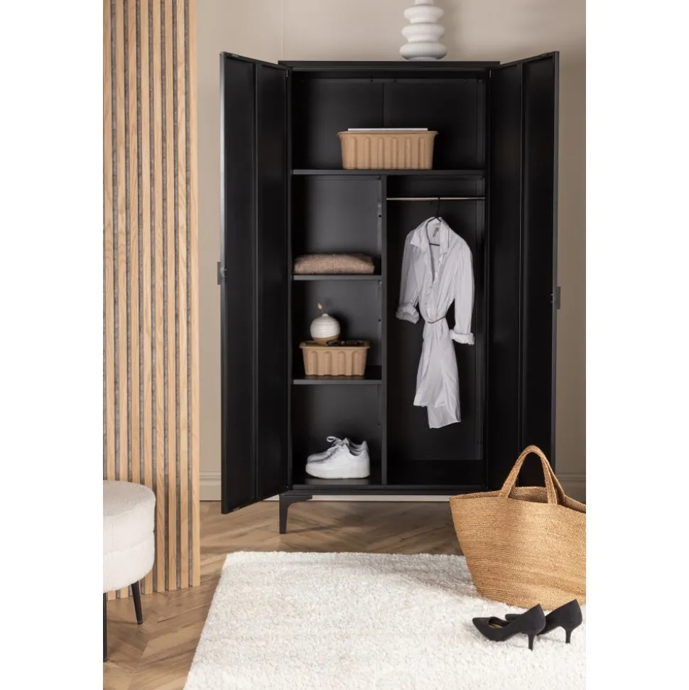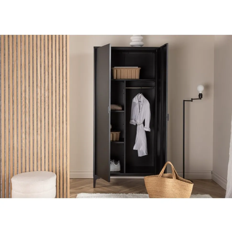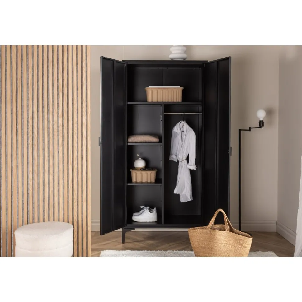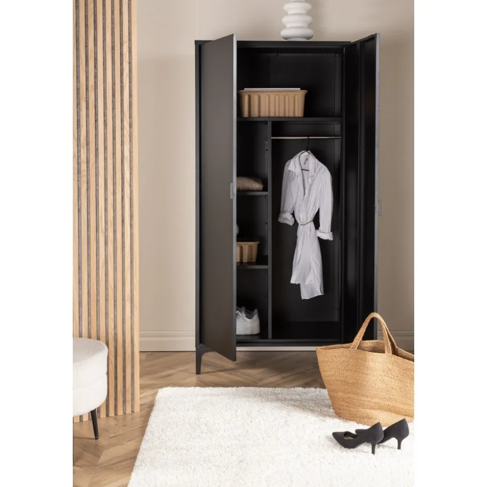 Kaxig och tidlös – Garderoben från serien Alexander är det perfekta tillskottet till sovrummet. Den här höga garderoben i svart stål har två dörrar som öppnar upp till fyra hyllplan och rymmer även plats för hängare så att de nystrukna kläderna slipper skrynklas. Alexander lyfts upp av fyra nätta ben som skapar ett luftigt intryck och underlättar också för dammsugaren. Investera i mer förvaringsyta till dig själv och få en snygg möbel i ditt hem på köpet.