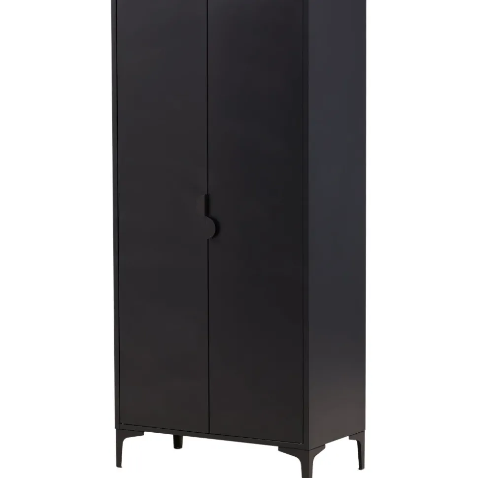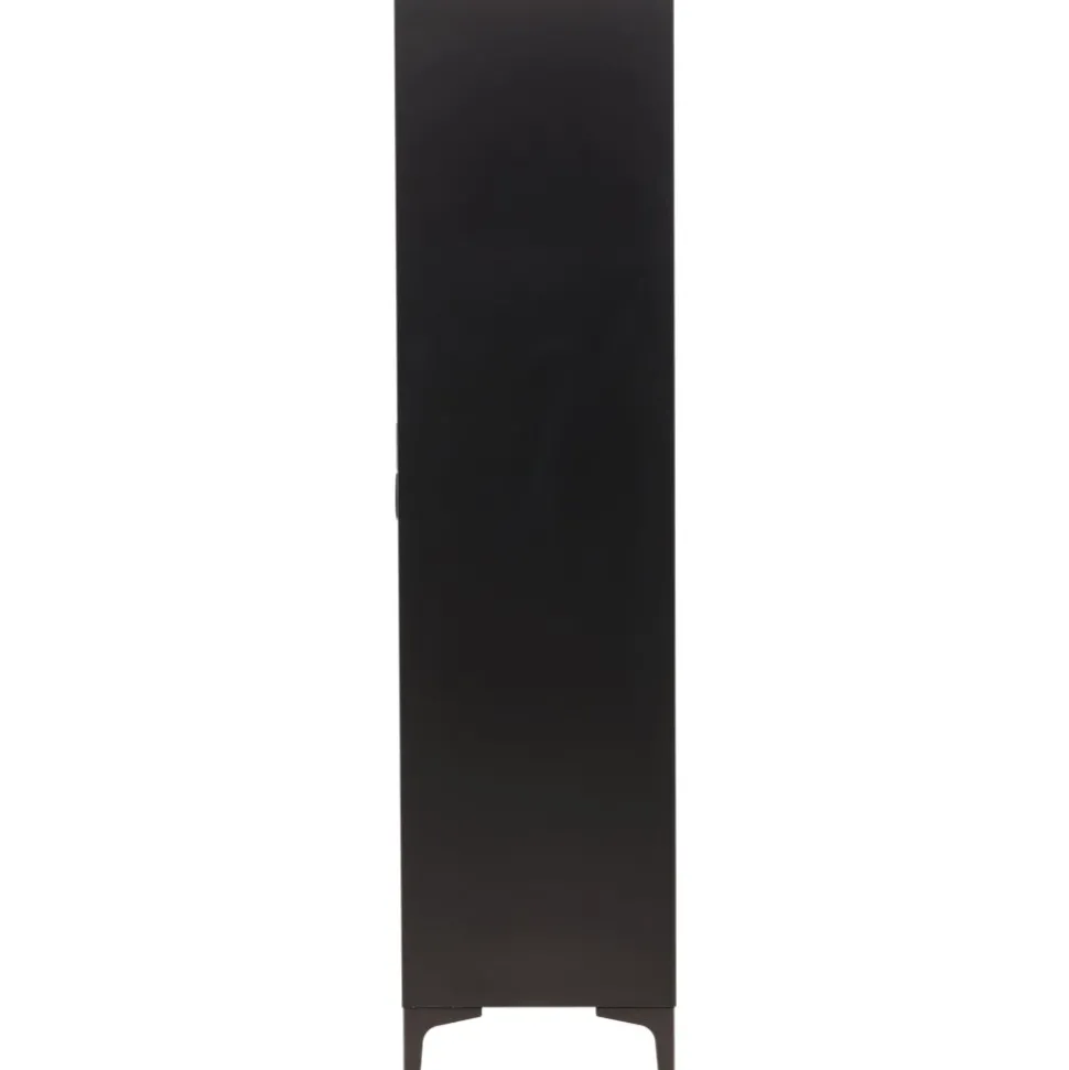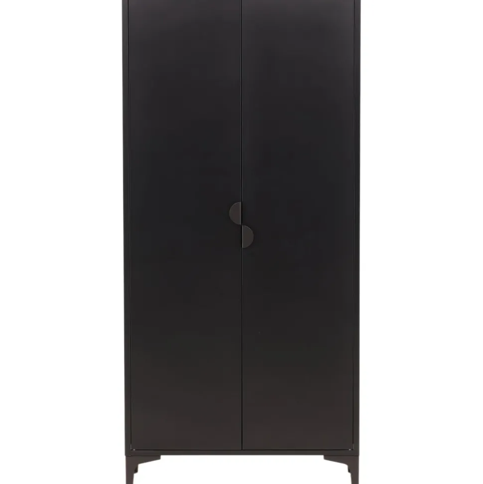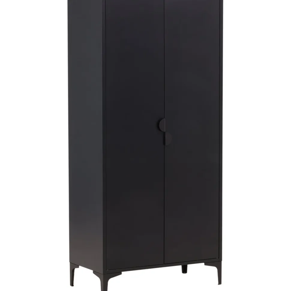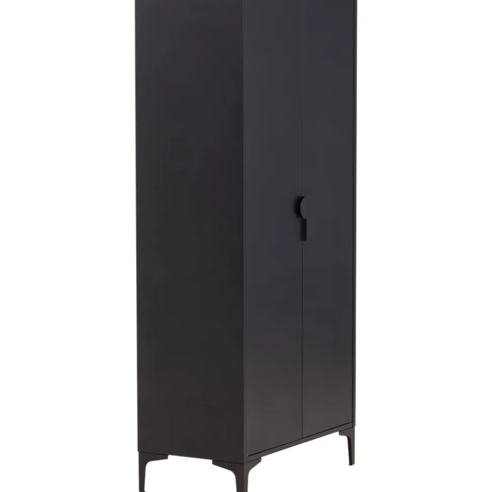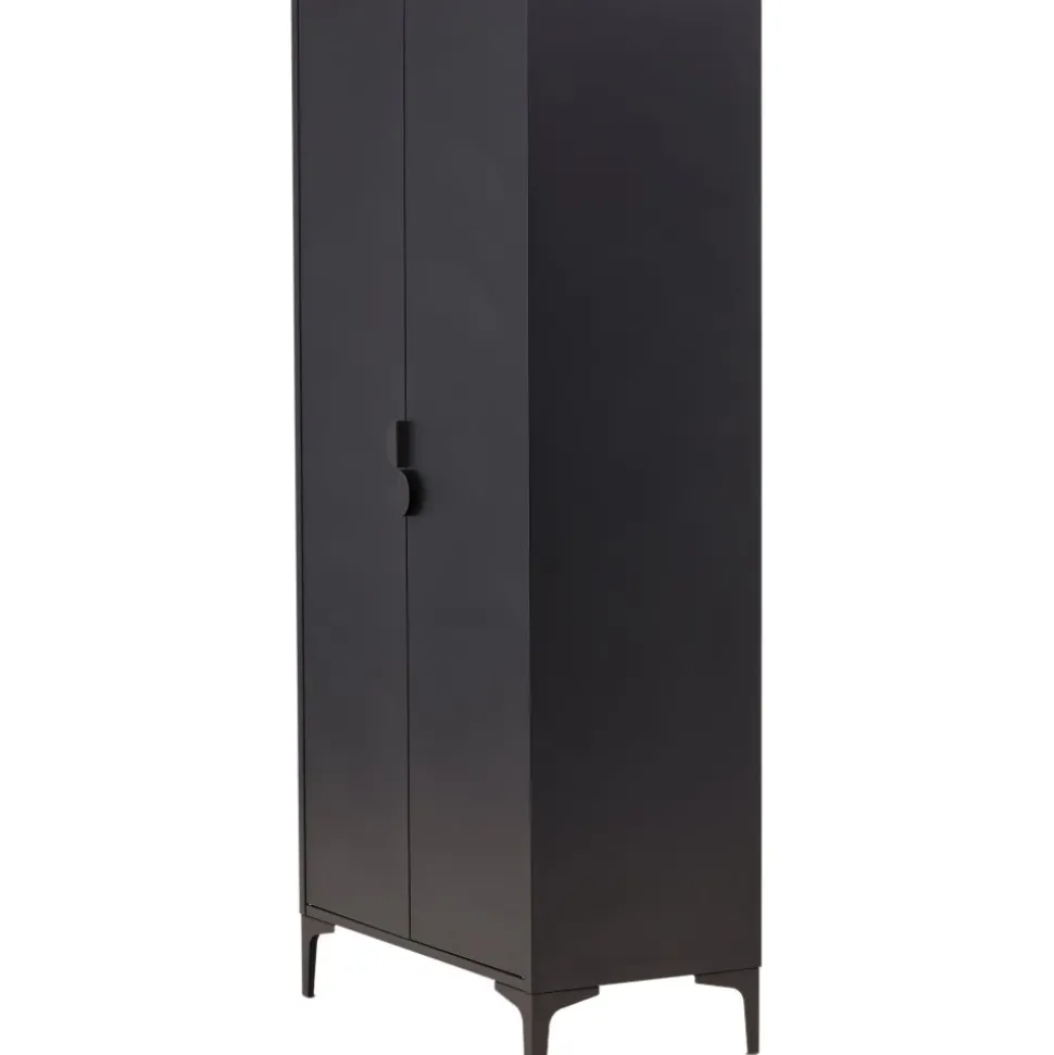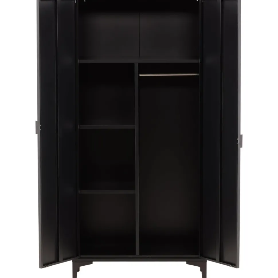Kaxig och tidlös – Garderoben från serien Alexander är det perfekta tillskottet till sovrummet. Den här höga garderoben i svart stål har två dörrar som öppnar upp till fyra hyllplan och rymmer även plats för hängare så att de nystrukna kläderna slipper skrynklas. Alexander lyfts upp av fyra nätta ben som skapar ett luftigt intryck och underlättar också för dammsugaren. Investera i mer förvaringsyta till dig själv och få en snygg möbel i ditt hem på köpet.
