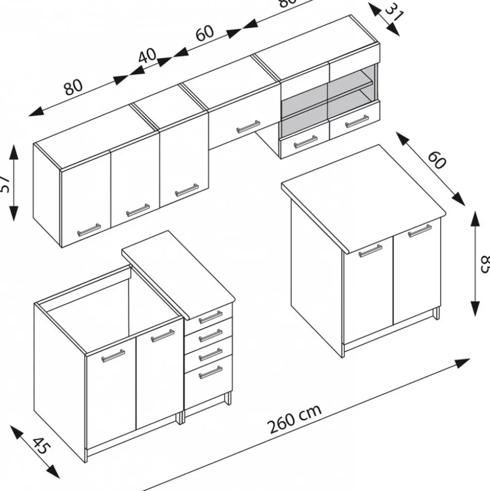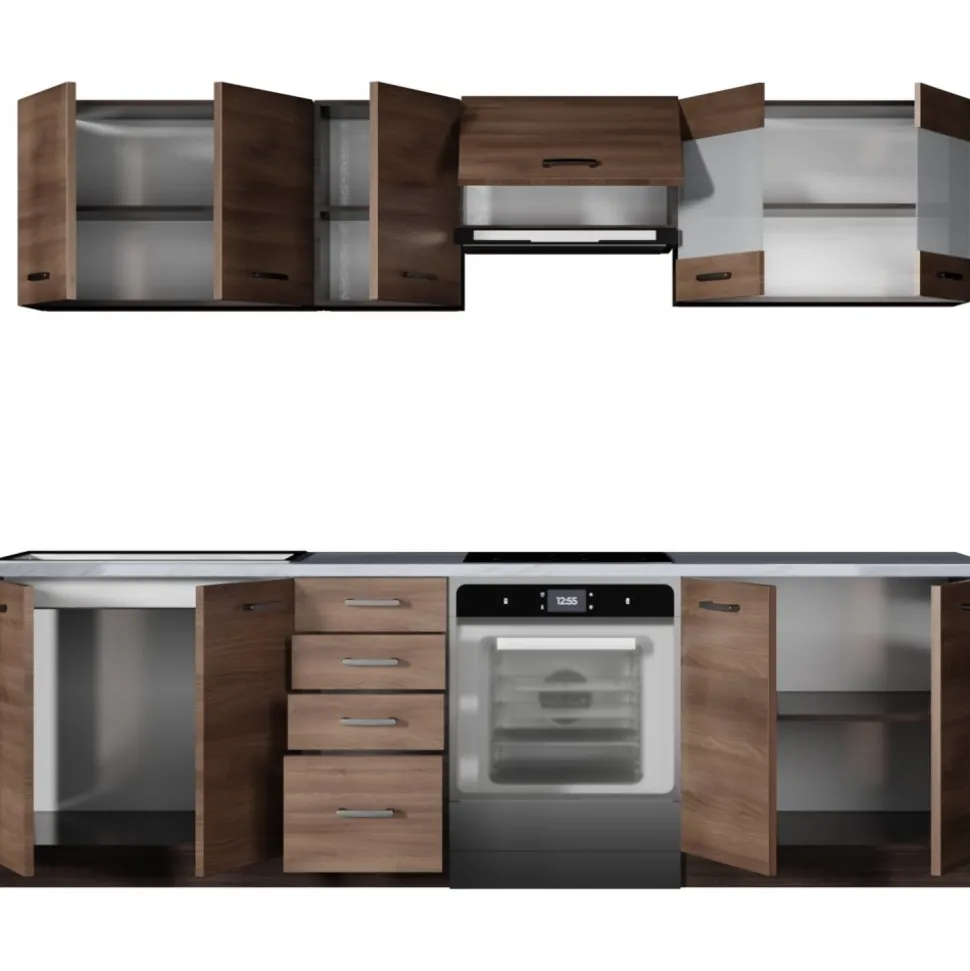 Kombinerar traditionell stil med hållbara material och funktionalitet i en elegant design. Med en total längd på 260 cm erbjuder detta ett rymligt förvaringsutrymme och en arbetsyta som är perfekt för både vardaglig användning och större matlagningstillfällen. De rika färgerna i mörkbrun och wenge, tillsammans med den granitgrå bänkskivan, ger köket ett sofistikerat och tidlöst utseende.