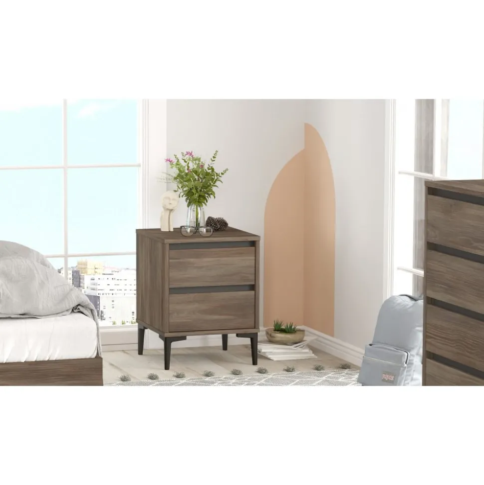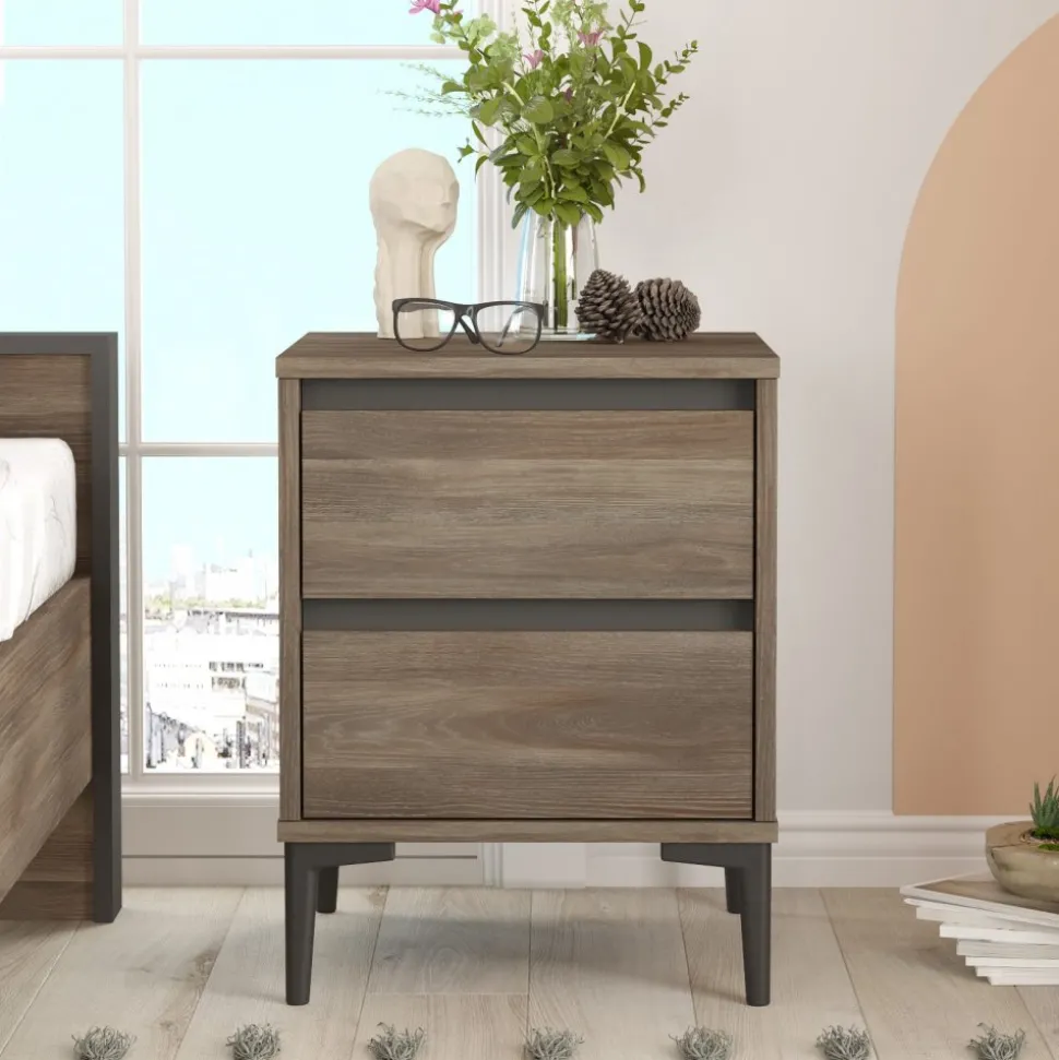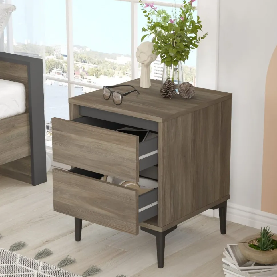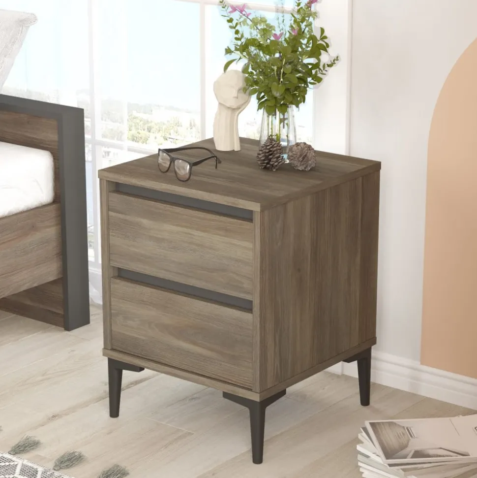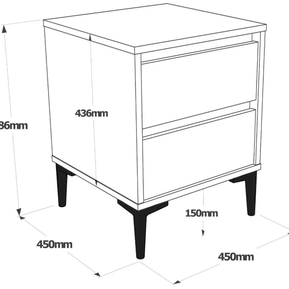 Sängbord av melaminbelagd spånskiva. Ben av plast.