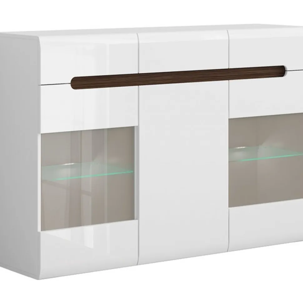 Skänk av trä med inbyggd LED-belysning. Med medföljande strips kan man välja färg på öppningen (vit, svart eller wenge).
