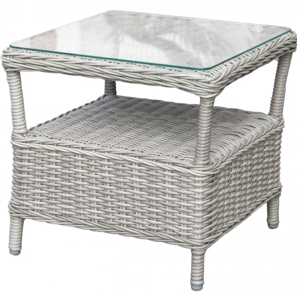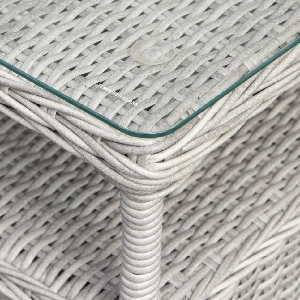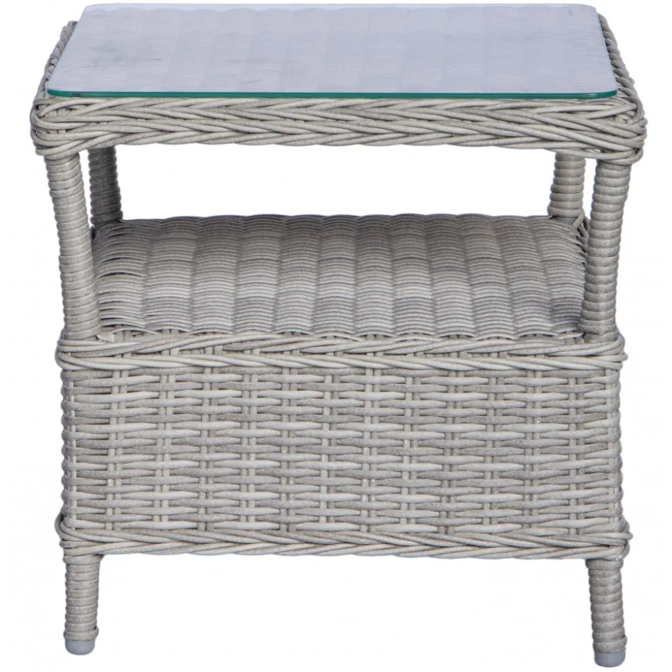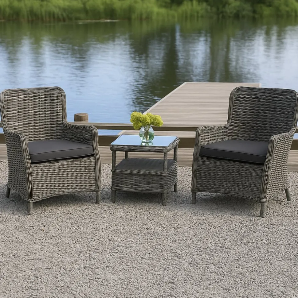 Balkongset består av ett praktiskt sidobord med en toppskiva av tempererat glas i grå konstrotting, tillsammans med bekväma fåtöljer med stomme i aluminium och mörkgrå dynor av polyester för extra sittkomfort. Bordet är från Tor-serien och fåtöljerna från Jacksonville-serien.