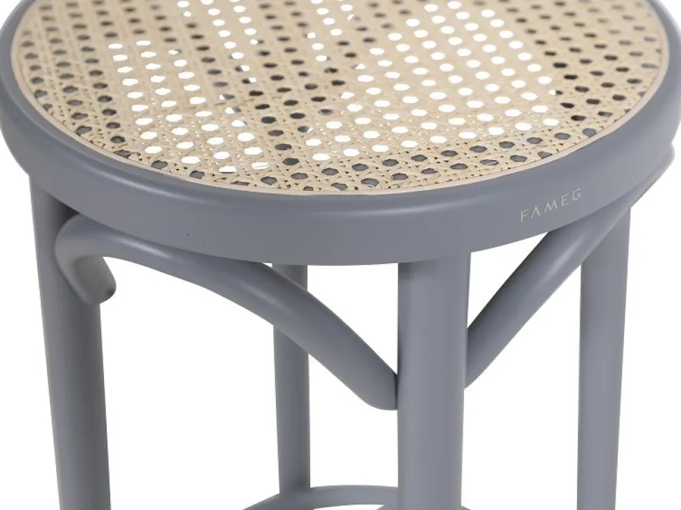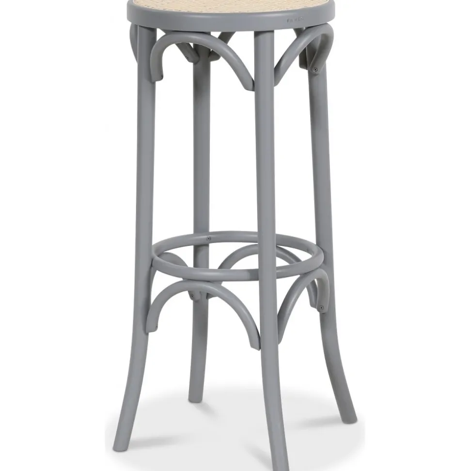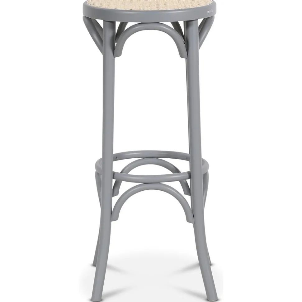 Barpall i grålackat böjträ med sits i naturrotting. Levereras monterad. En klassiker som är formgiven av Michael Thonet.