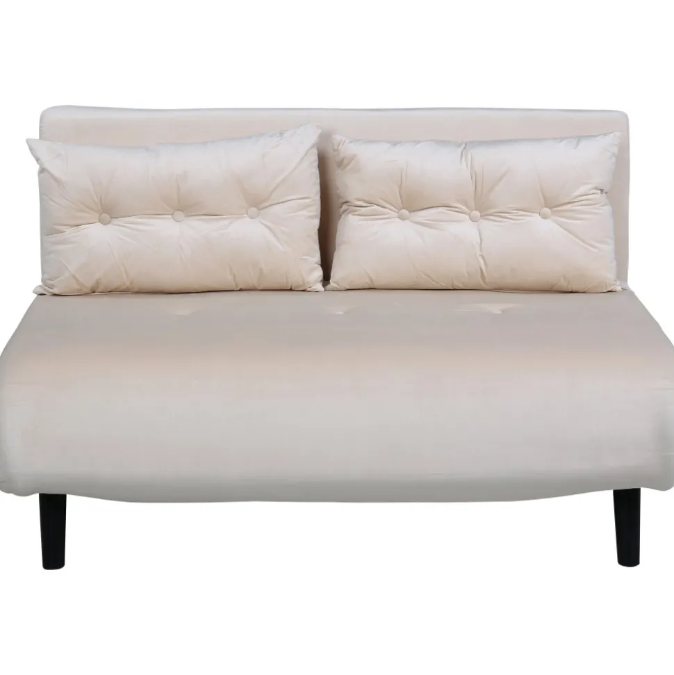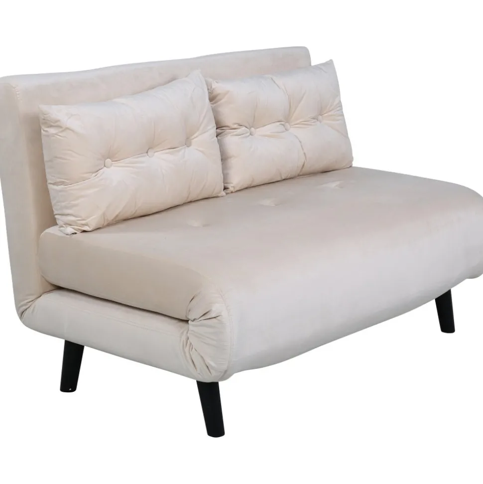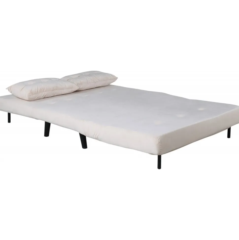 Bäddsoffa av metall, klädd med polyestertyg.