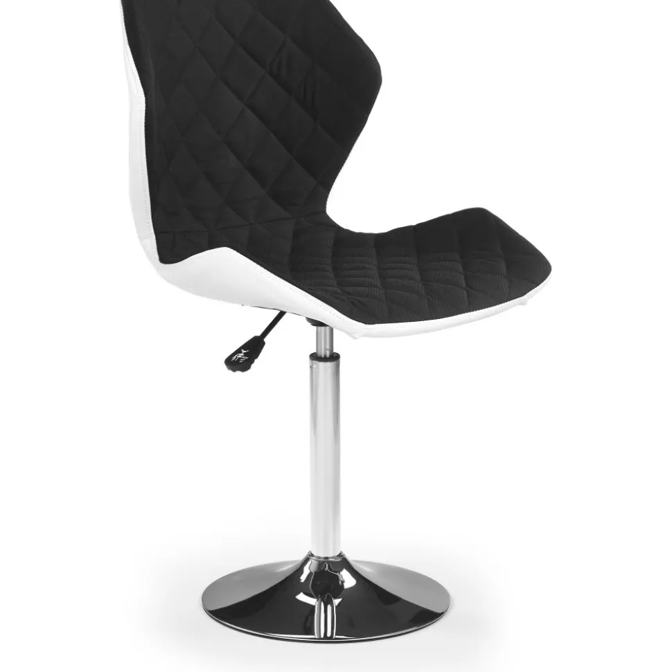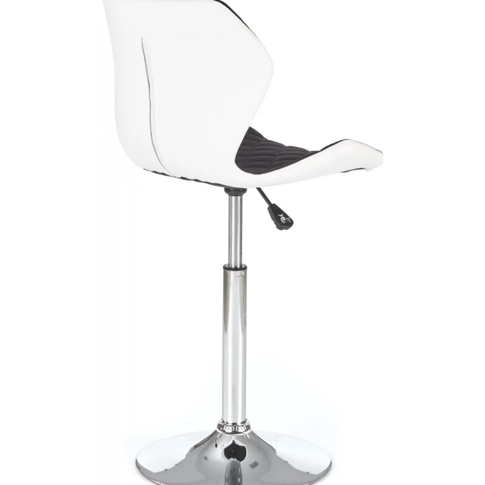 En härlig med en modern design. Underredet är tillverkat av kromad metall och sitsen är klädd med ett mycket behagligt vitt konstläder och svart tyg. Sitsens höjd är reglerbar med hjälp av spaken undertill.