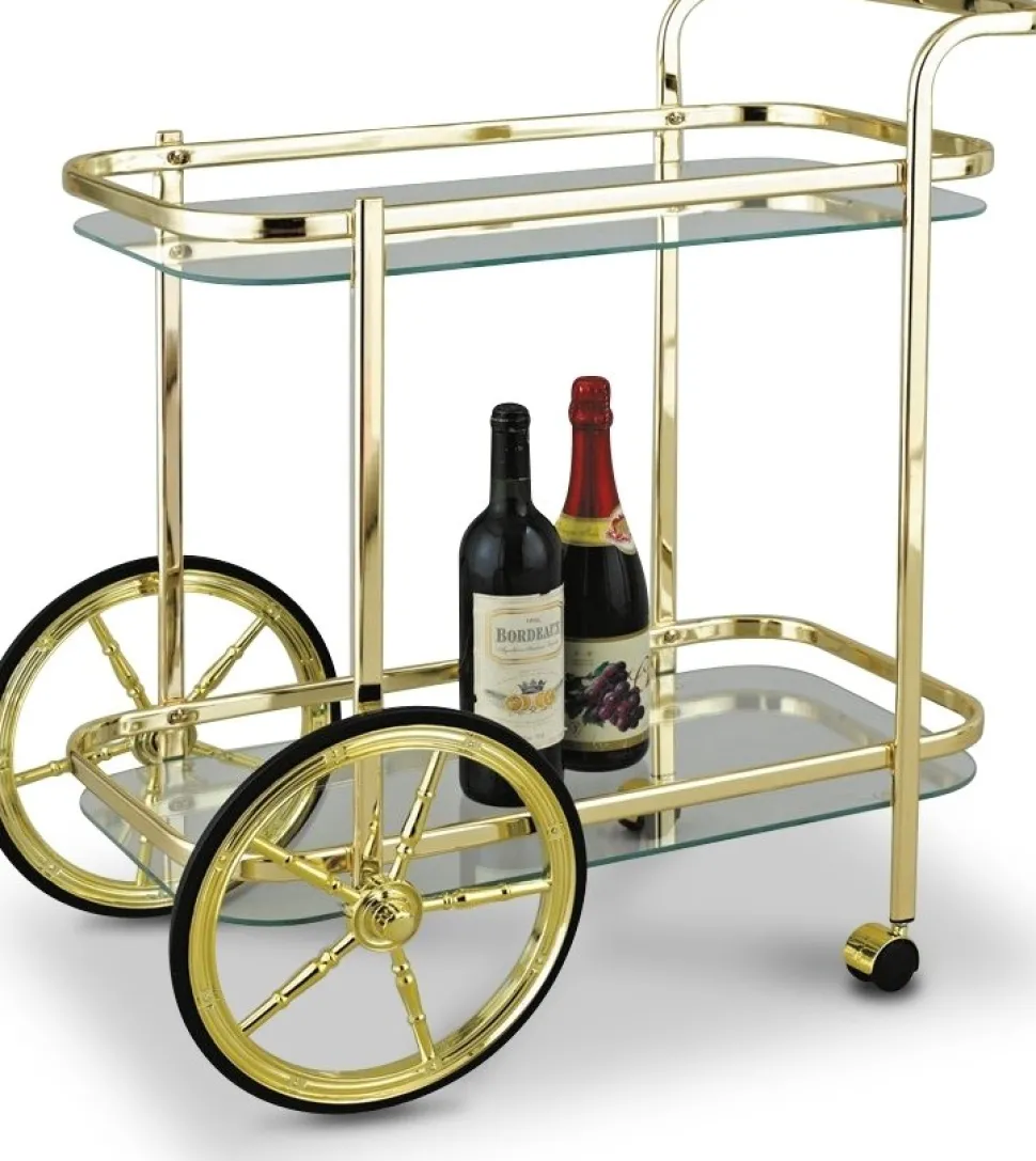 Vagnen är utrustad med ett stabilt handtag för lätt manövrering och 2 glashyllor i härdat glas med kantstöd som håller saker på plats. De stora främre hjulen ger stabilitet och stil, medan de små bakre hjulen ger den klassiska designen sin charm. Perfekt för både vardagsbruk och festliga tillfällen.