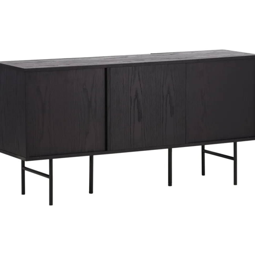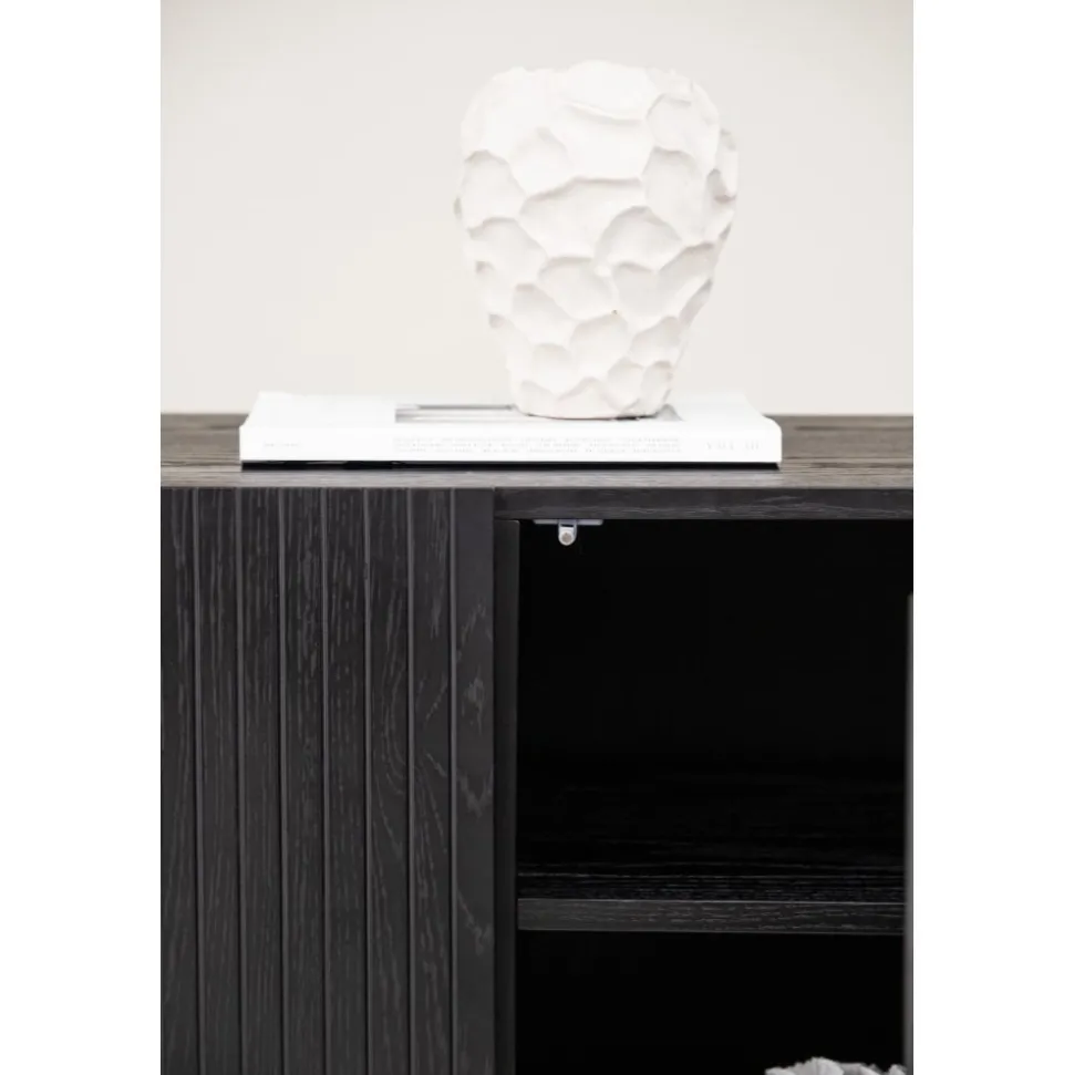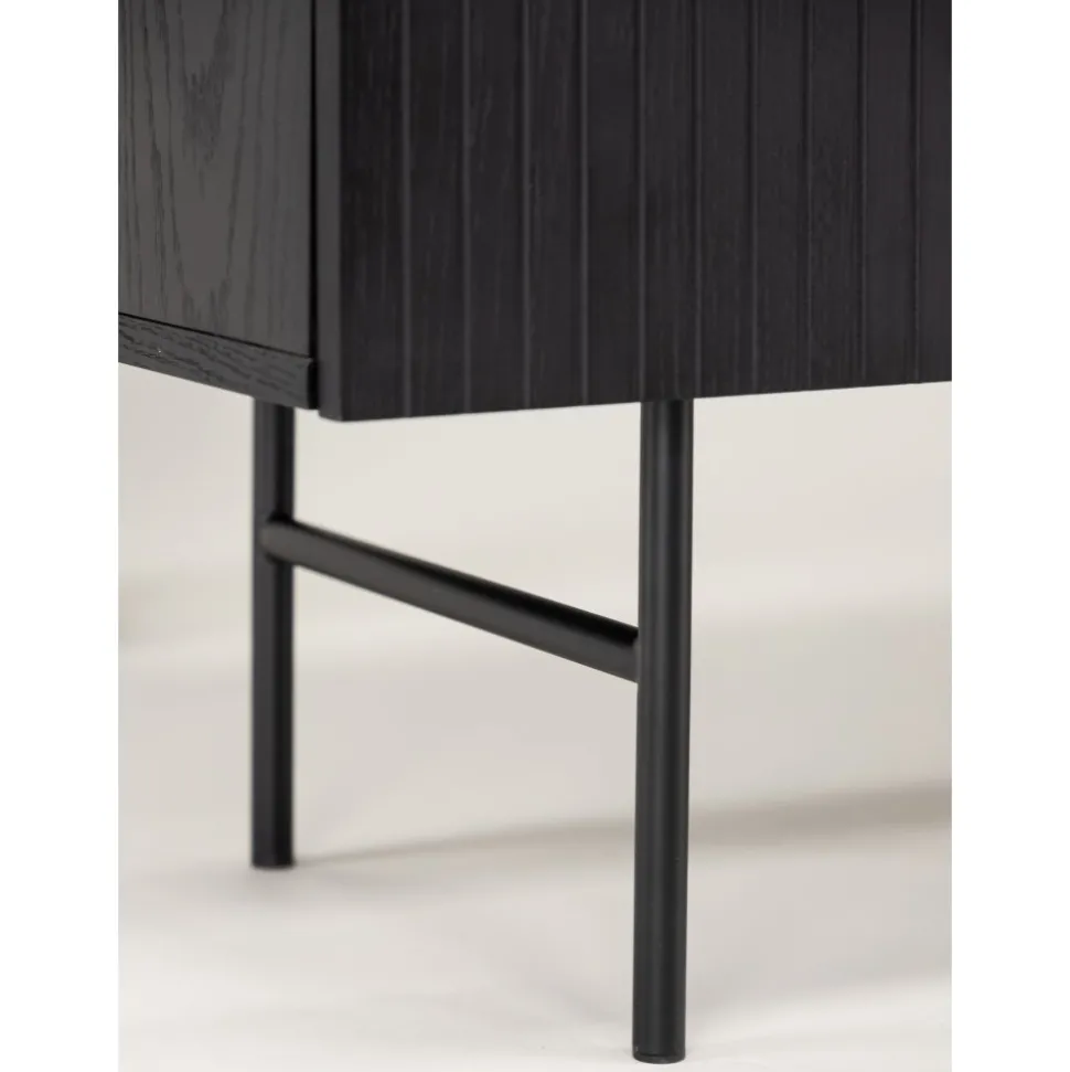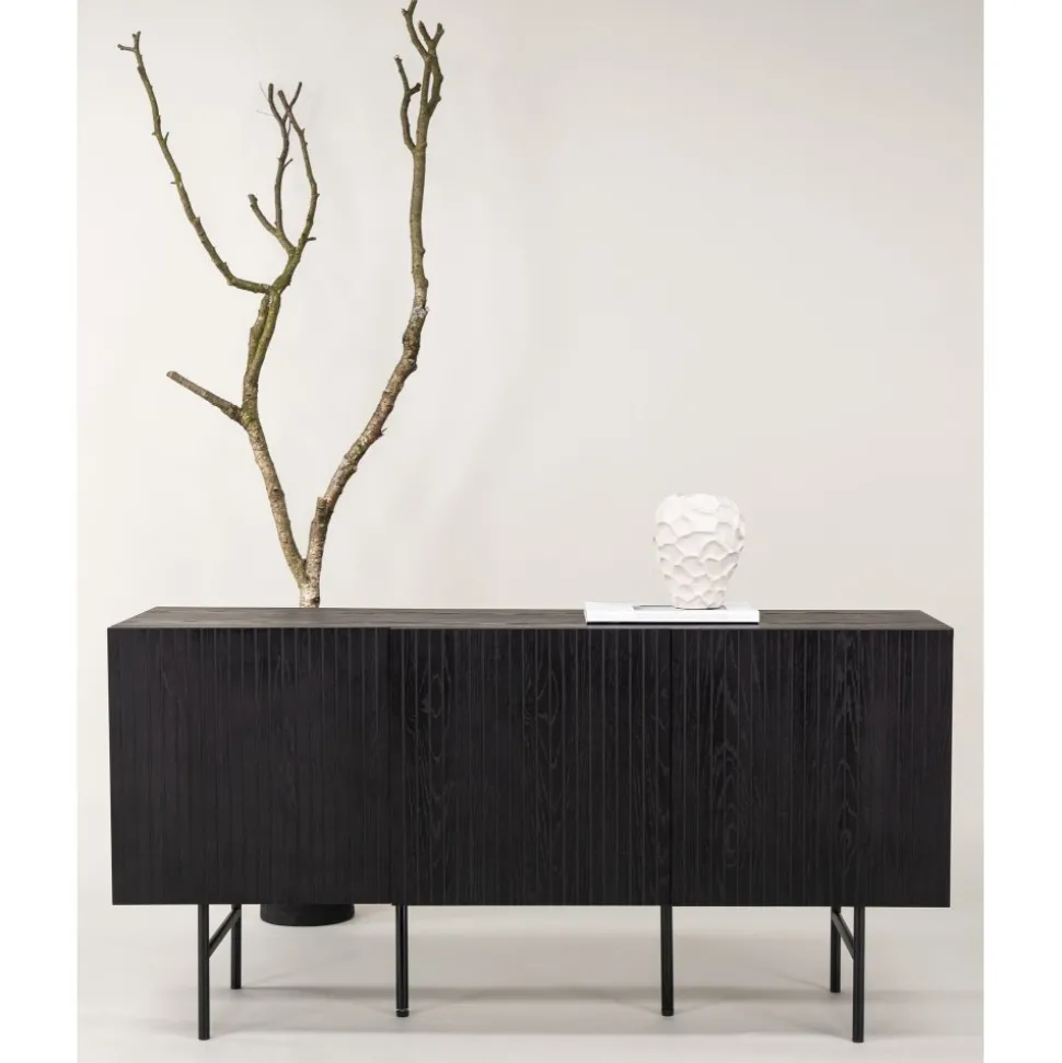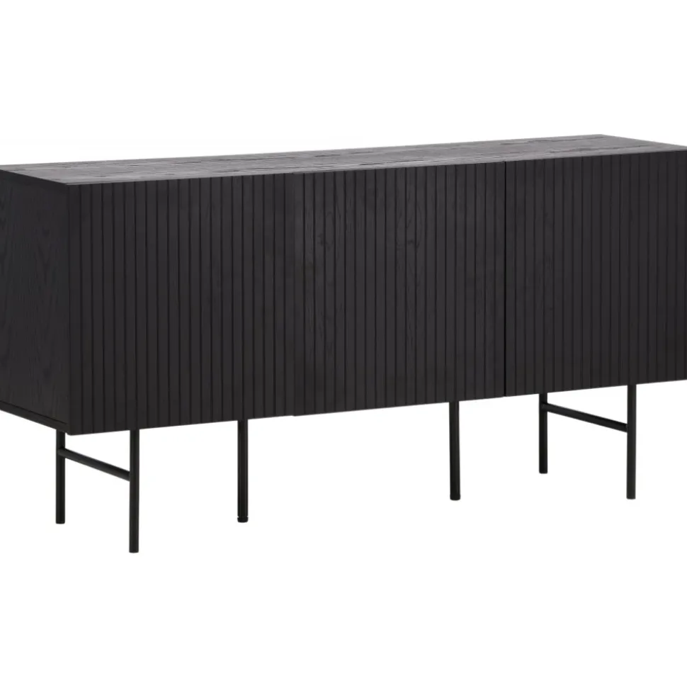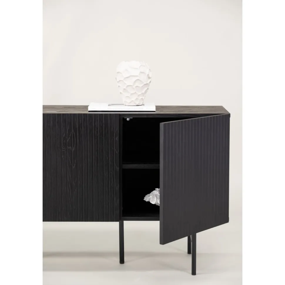 Skänk i skandinavisk design med stilsäker utformning. Den här skänken har tre luckor i ribbad design med två hyllplan som möjliggör dold förvaring. Den är tillverkad i svart faner och lyfts upp av smala ben i svart stål. Använd som skänk med vackra dekorationer och ljusstakar på eller som tv-bänk i vardagsrummet. Här får du en möbel som är lika snygg som smart.
